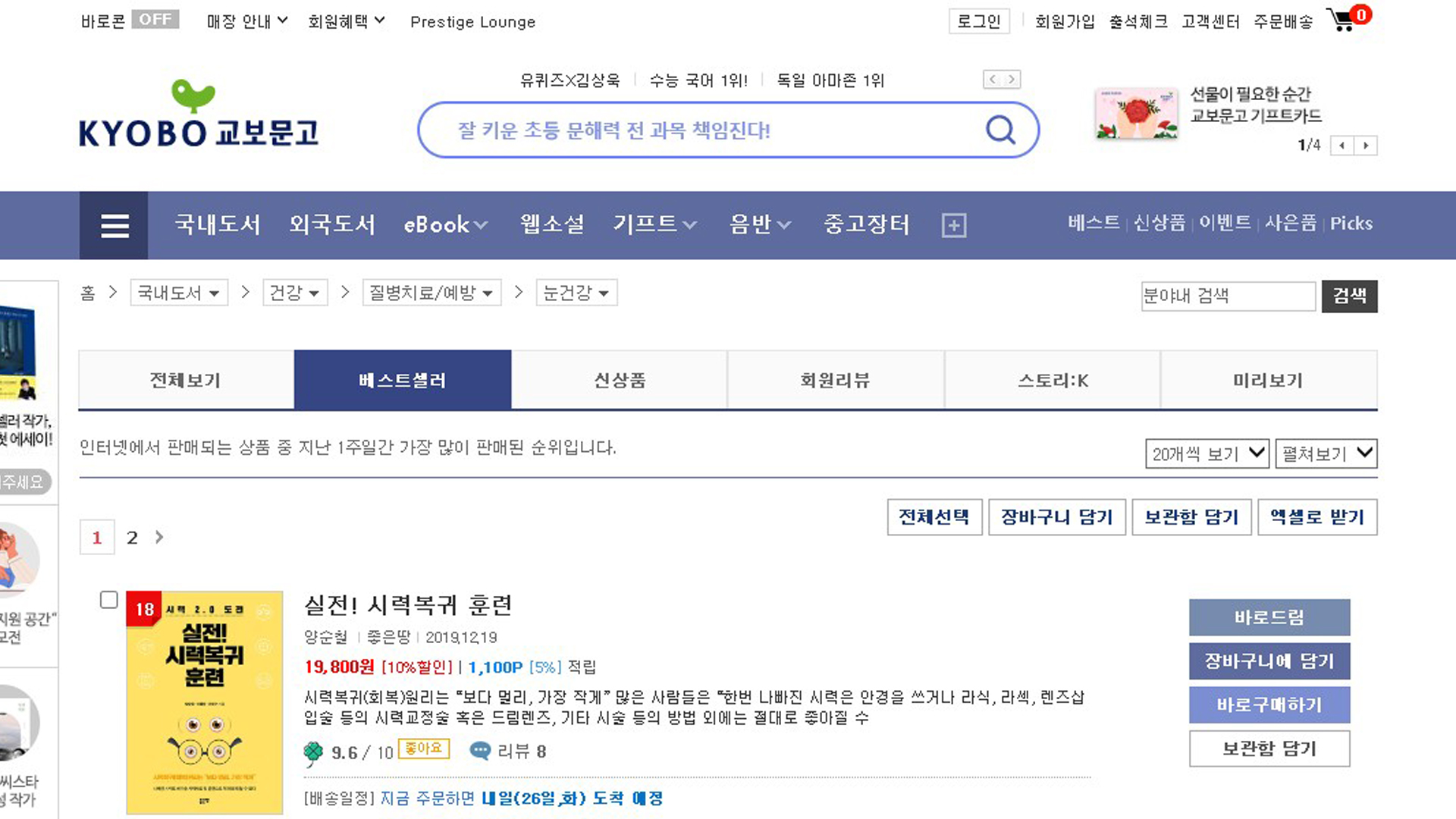 실전시력복귀훈련 교보문고 베스트셀러 2022년 7월 4주 25일 질병치료예방 주간 베스트 197위 눈건강 18위