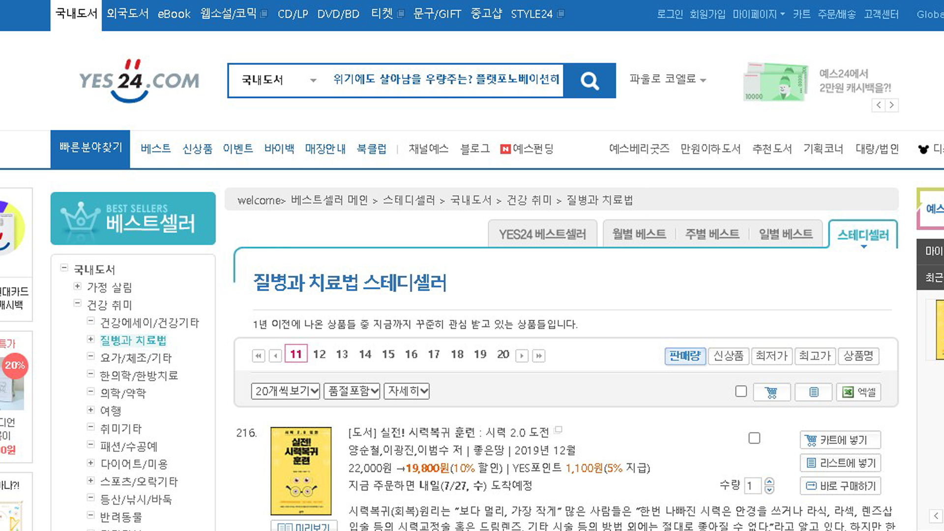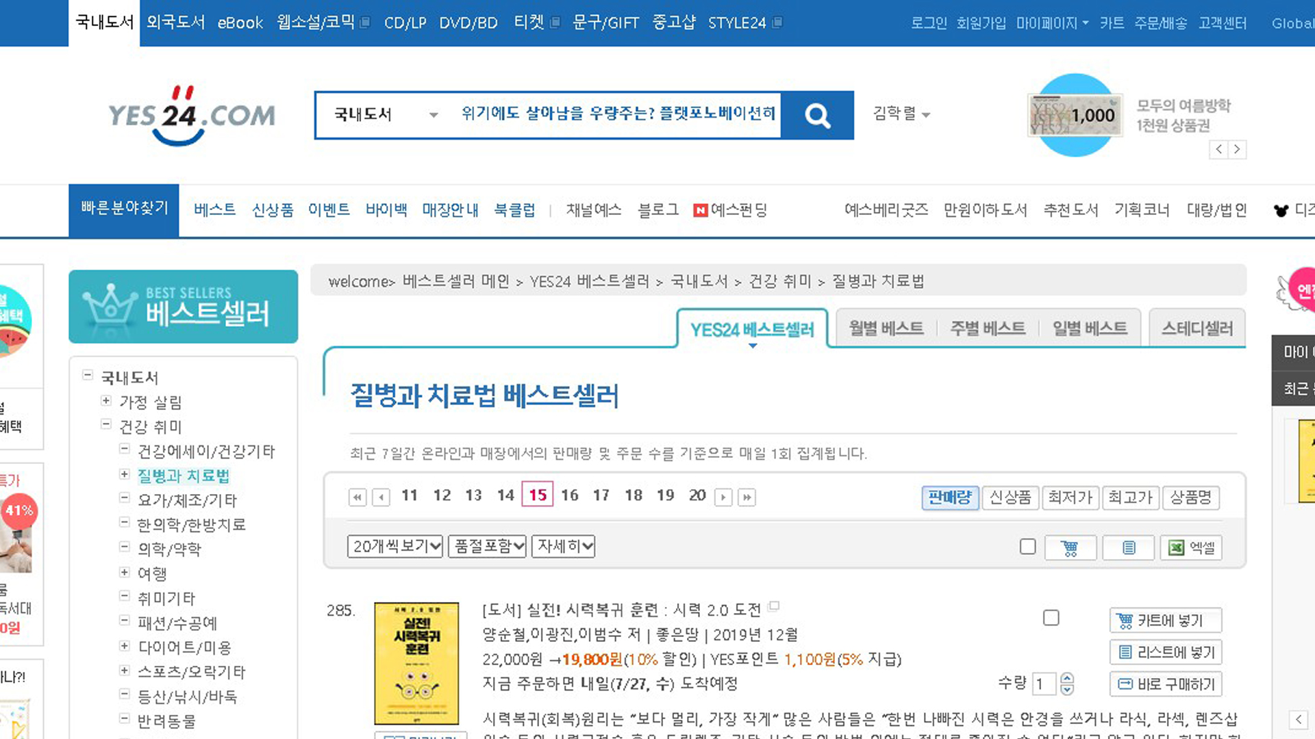 실전시력복귀훈련 예스24 2022년 7월 4주 26일 질병과치료법 베스트셀러 285위 스테디셀러 216위 TOP100 18주