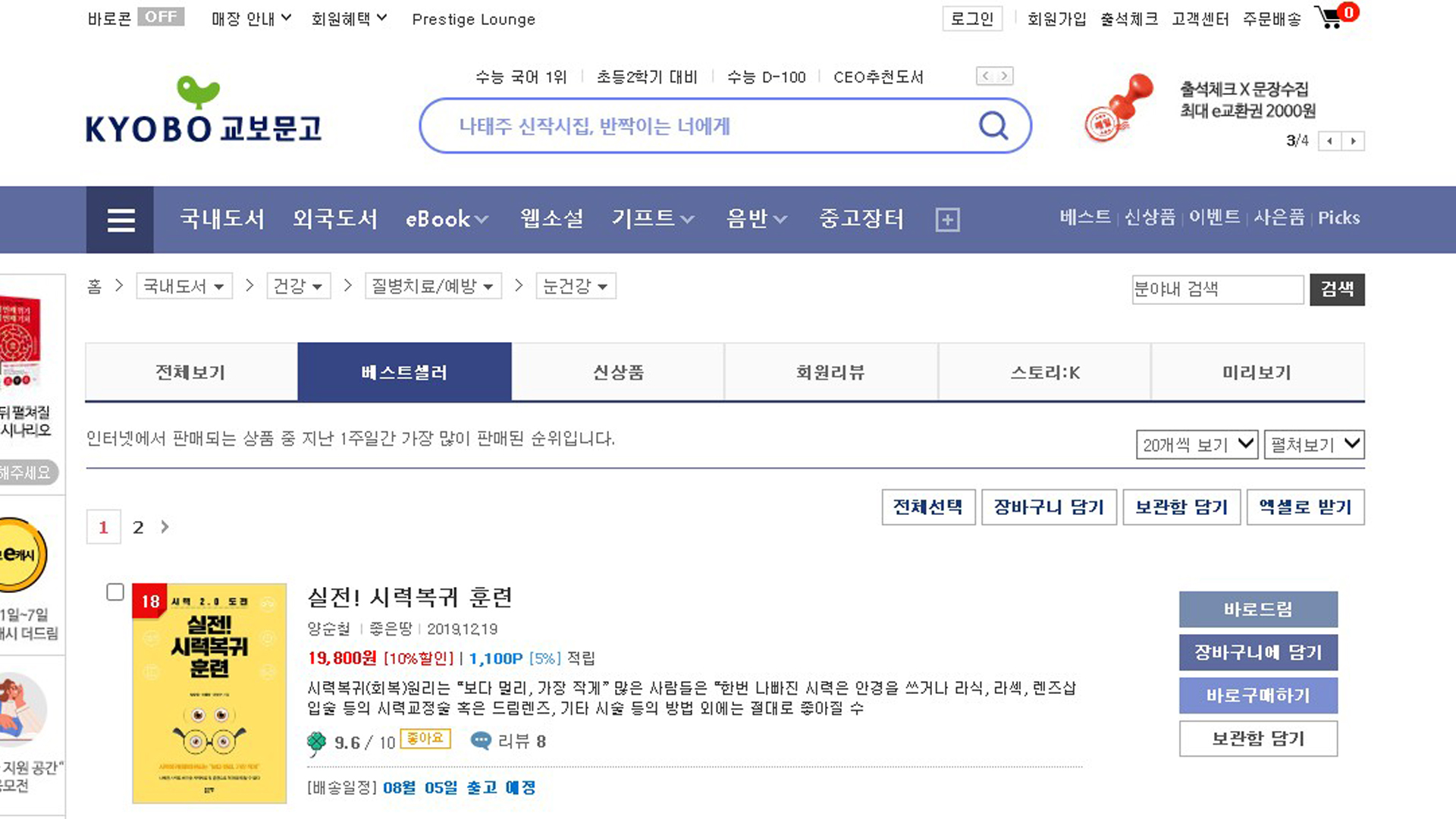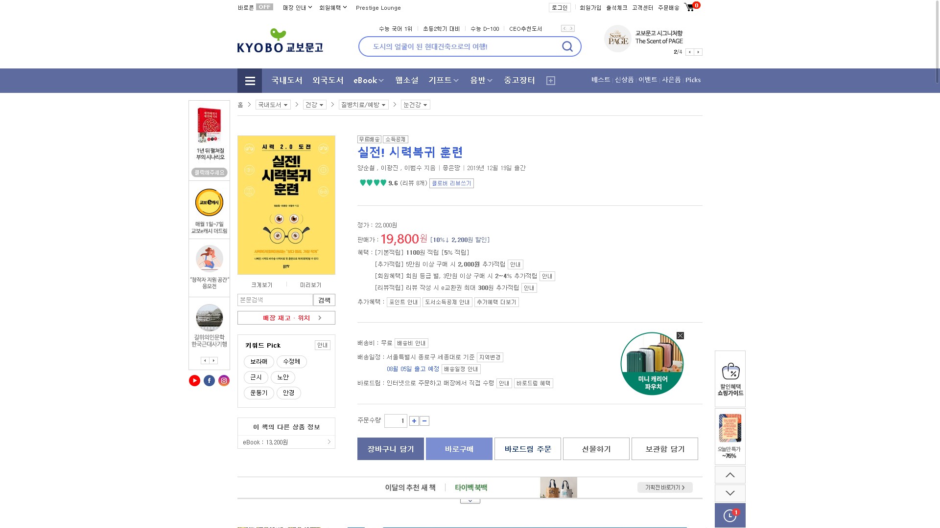 실전시력복귀훈련 교보문고 베스트셀러 2022년 7월 4주 8월 4일 질병치료예방 190위입니다.