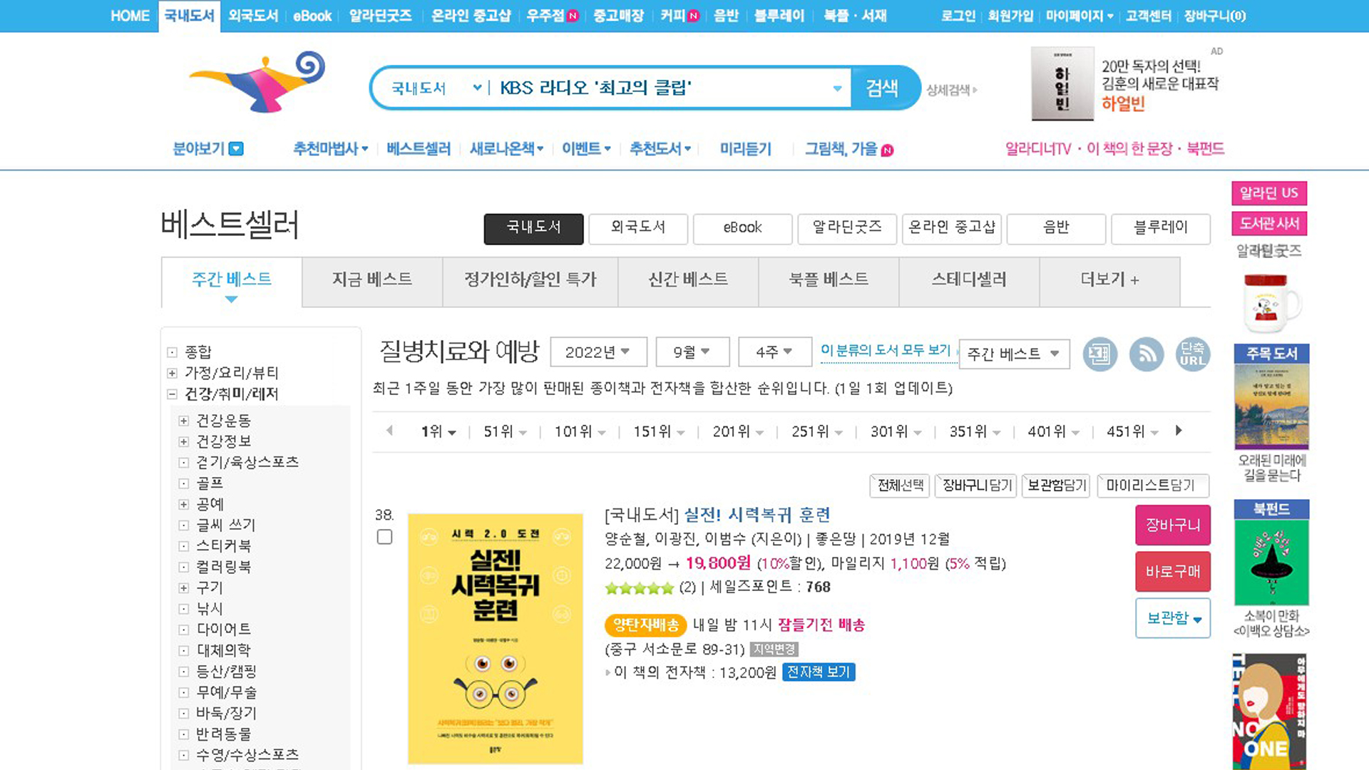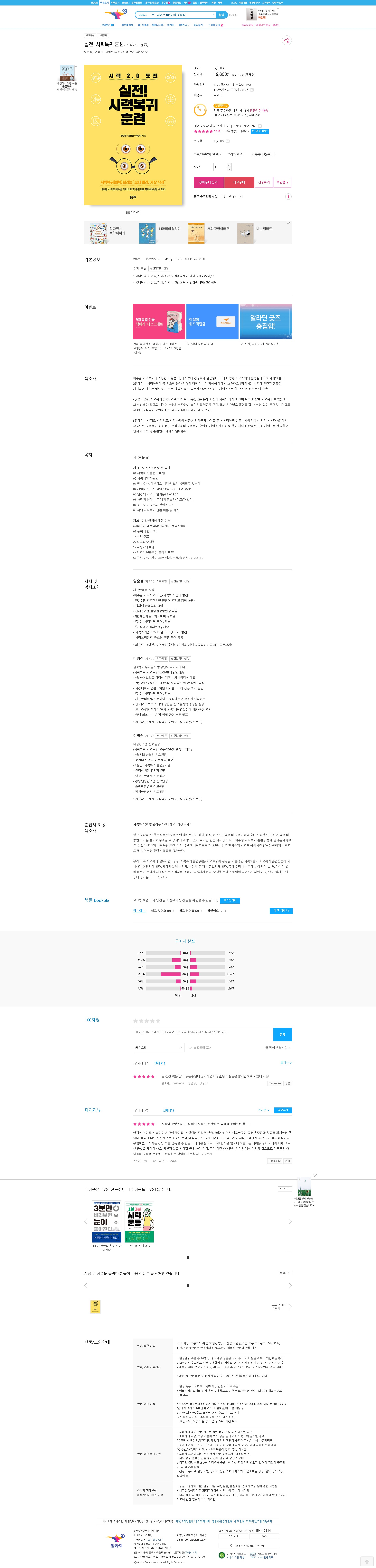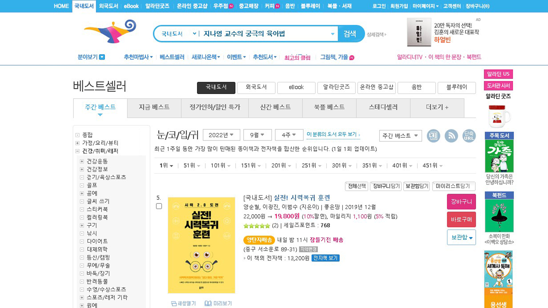실전시력복귀훈련 알라딘 베스트셀러 2022년 9월 4주 27일 질병치료와예방 베스트셀러 38위입니다.