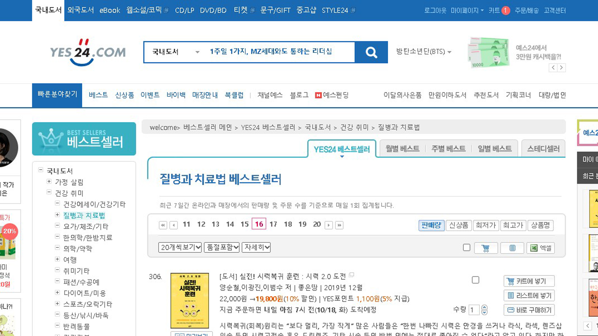 실전시력복귀훈련 예스24 2022년 10월 2주 10월 17일 질병과치료법 베스트셀러 306위 스테디셀러 212위 TOP100 18주