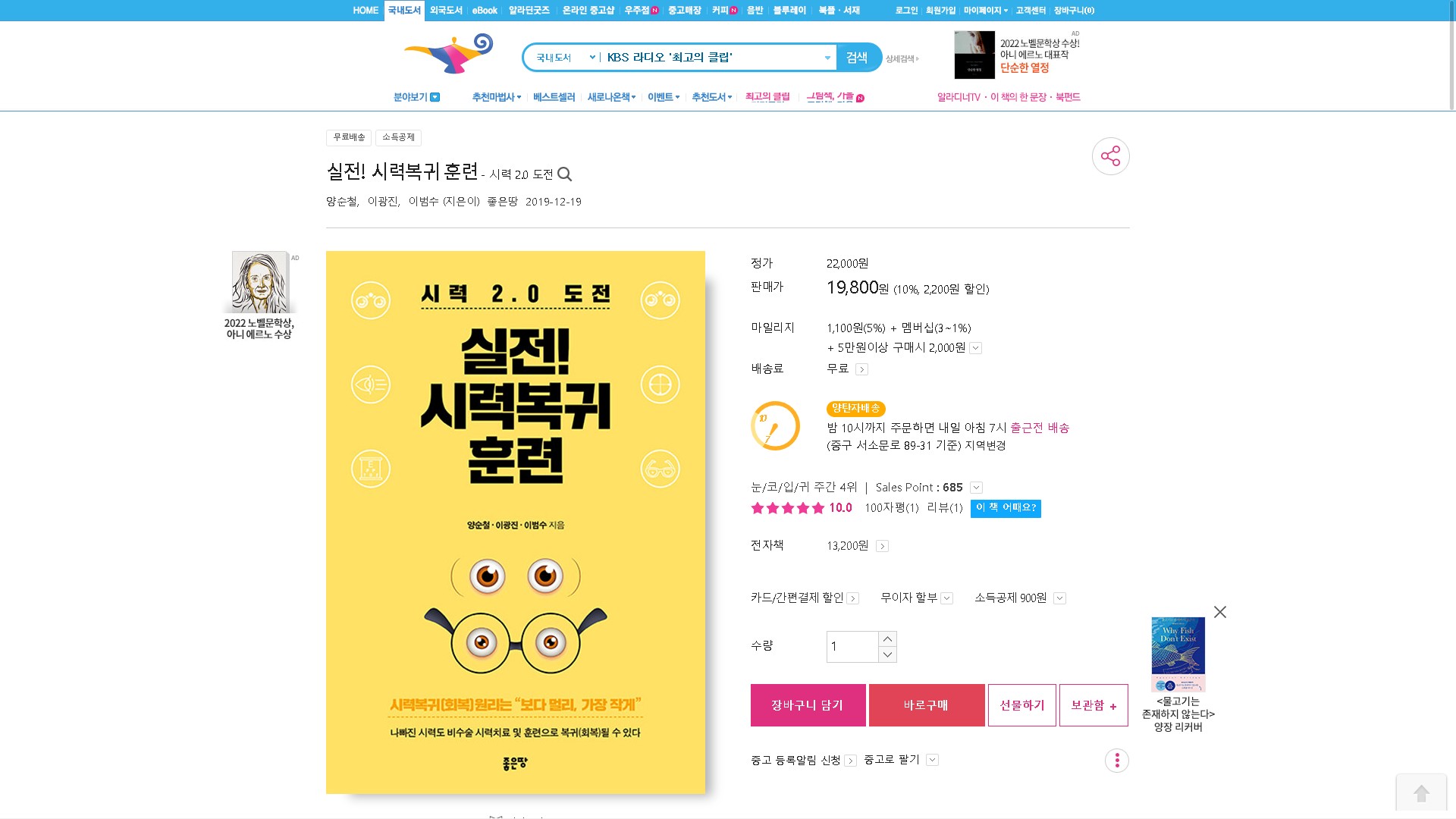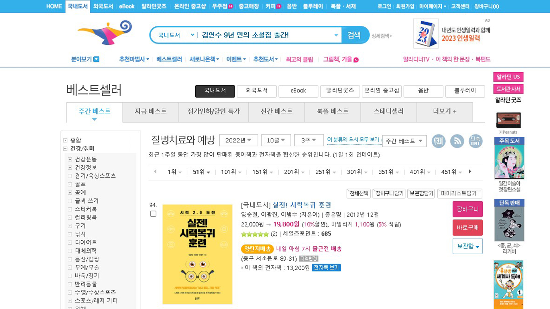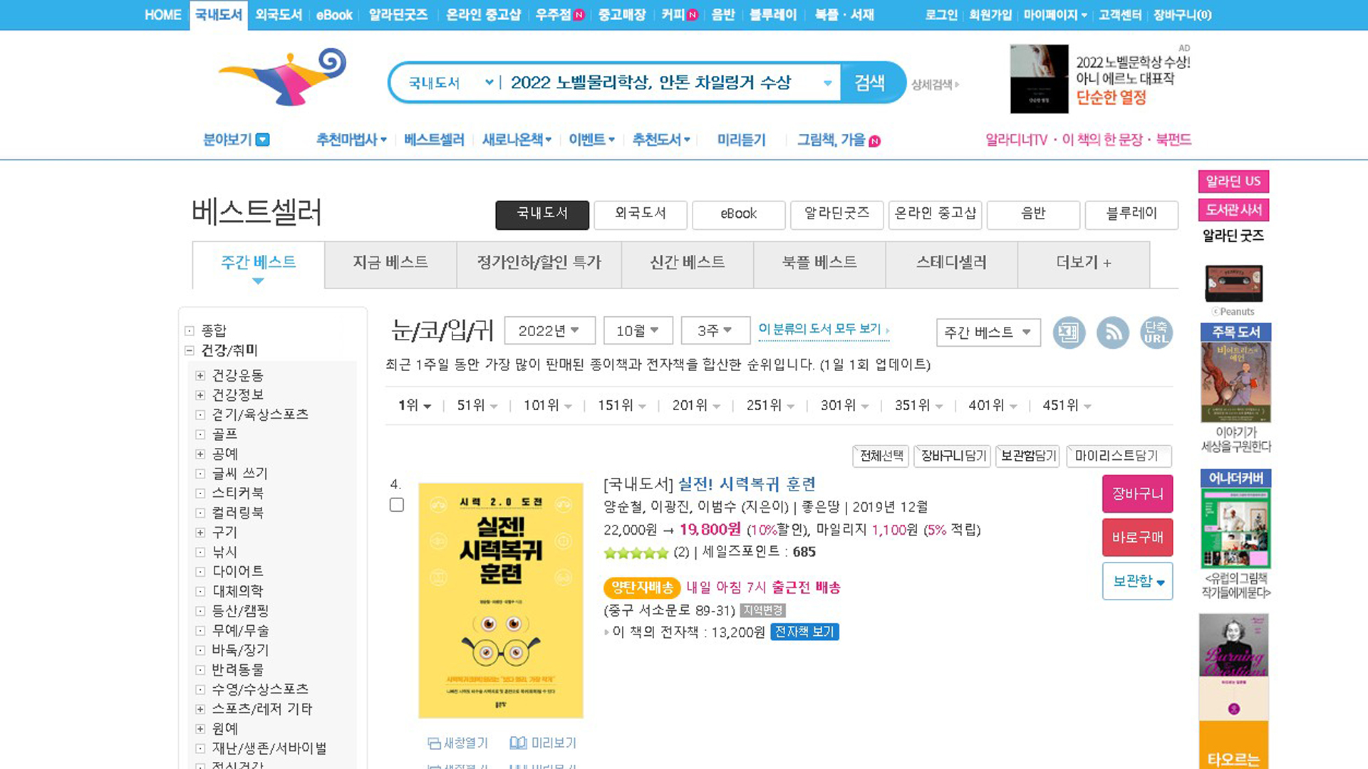 실전시력복귀훈련 알라딘 베스트셀러 2022년 10월 2주 17일 질병치료와예방 베스트셀러 94위입니다.