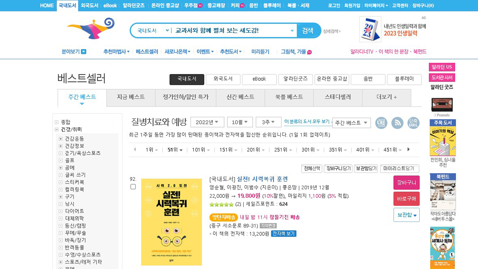 실전시력복귀훈련 알라딘 베스트셀러 2022년 10월 2주 19일 질병치료와예방 베스트셀러 92위입니다.