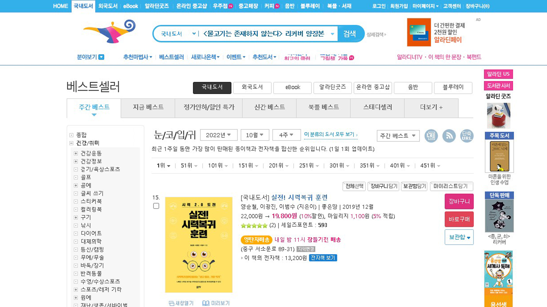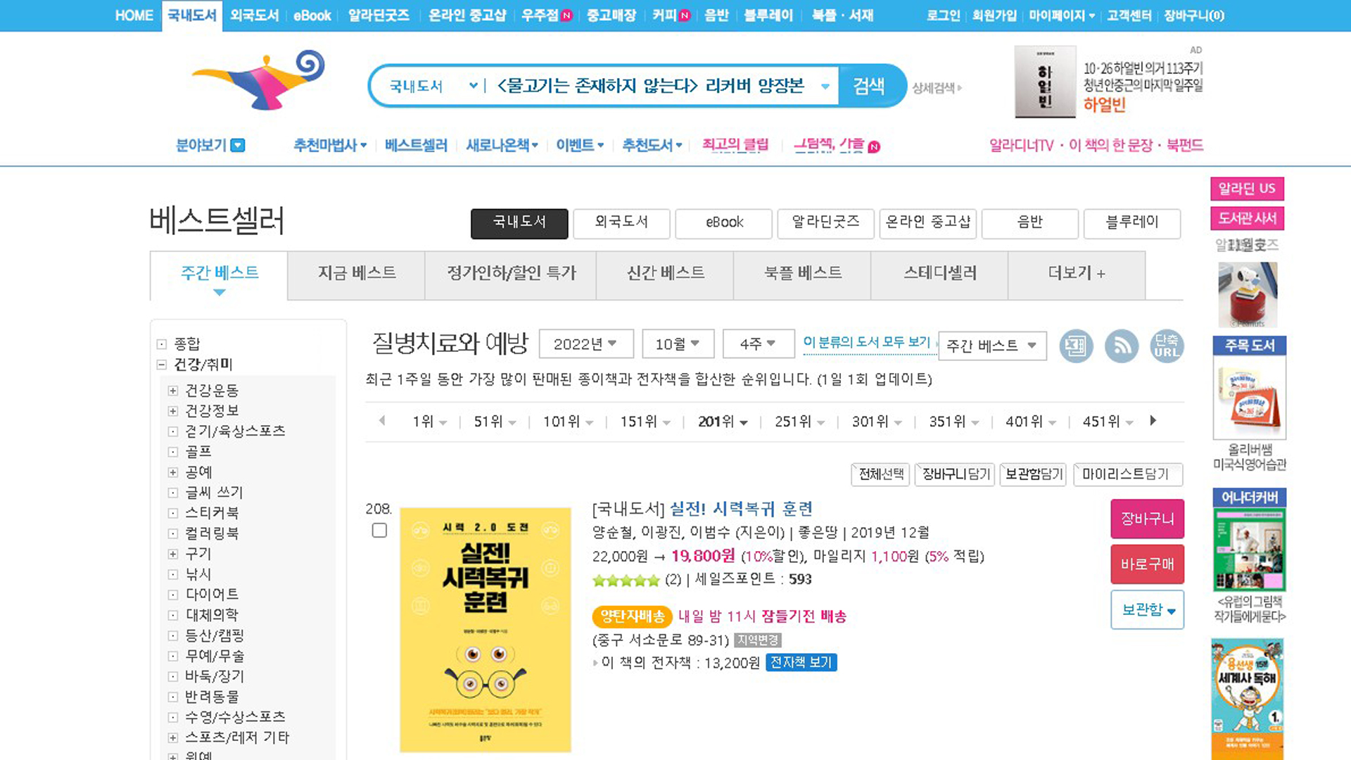 실전시력복귀훈련 알라딘 베스트셀러 2022년 10월 4주 29일 질병치료와예방 베스트셀러 208위입니다.