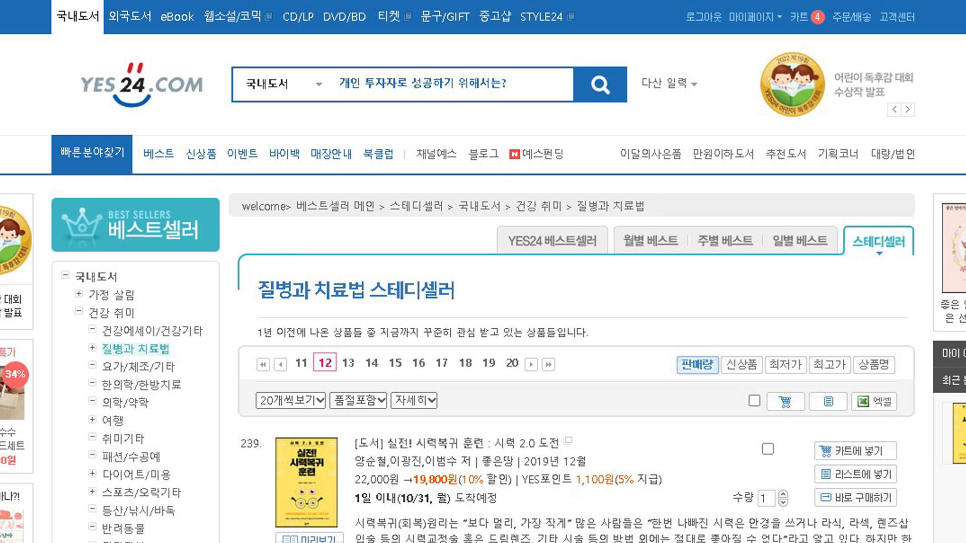 실전시력복귀훈련 예스24 2022년 10월 4주 29일 질병과치료법 판매량순 베스트셀러 303위 스테디셀러 239위 TOP100 18주
