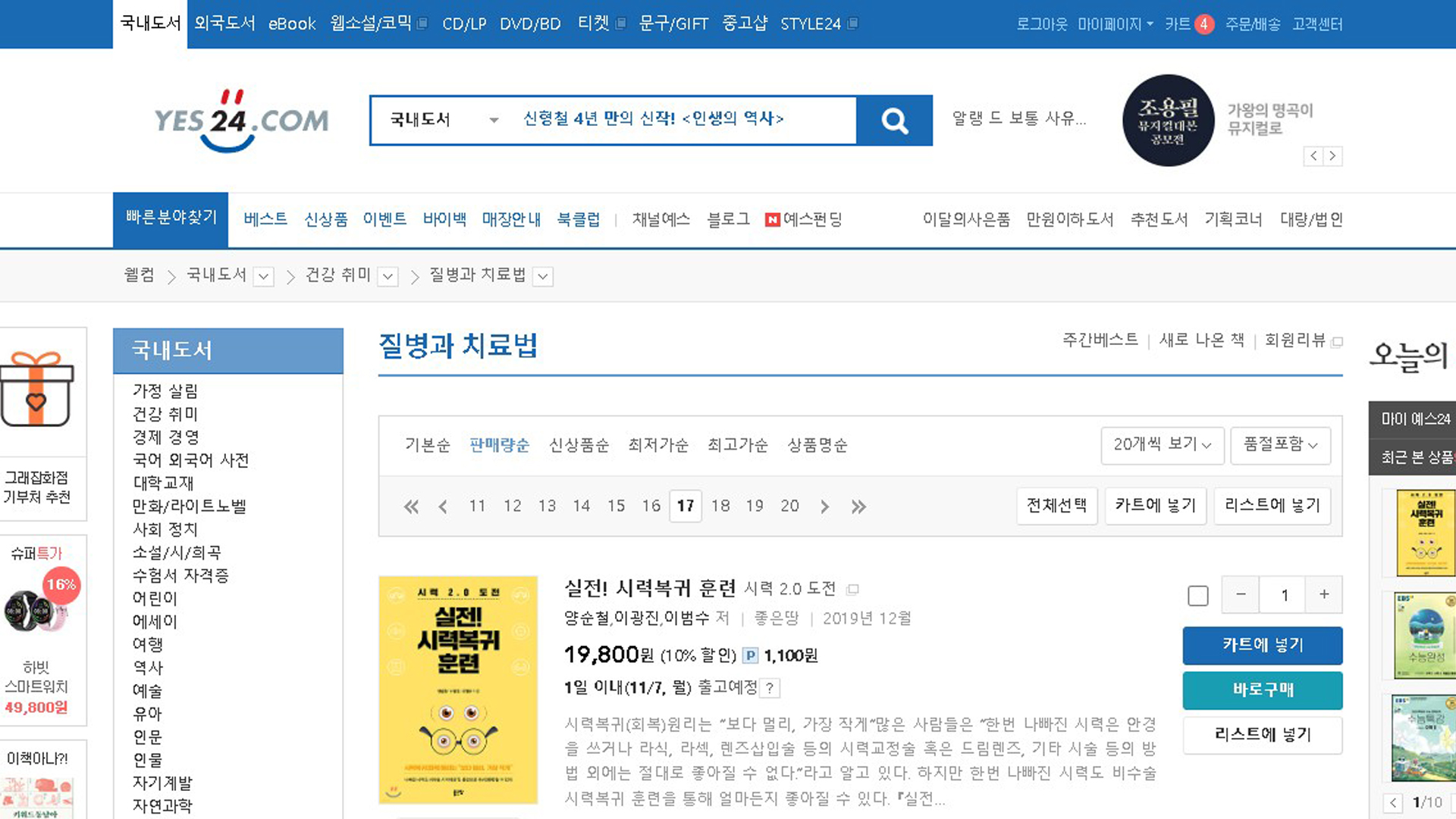 실전시력복귀훈련 예스24 2022년 11월 1주 6일 질병과치료법 판매량순 베스트셀러 321위 스테디셀러 245위 TOP100 18주