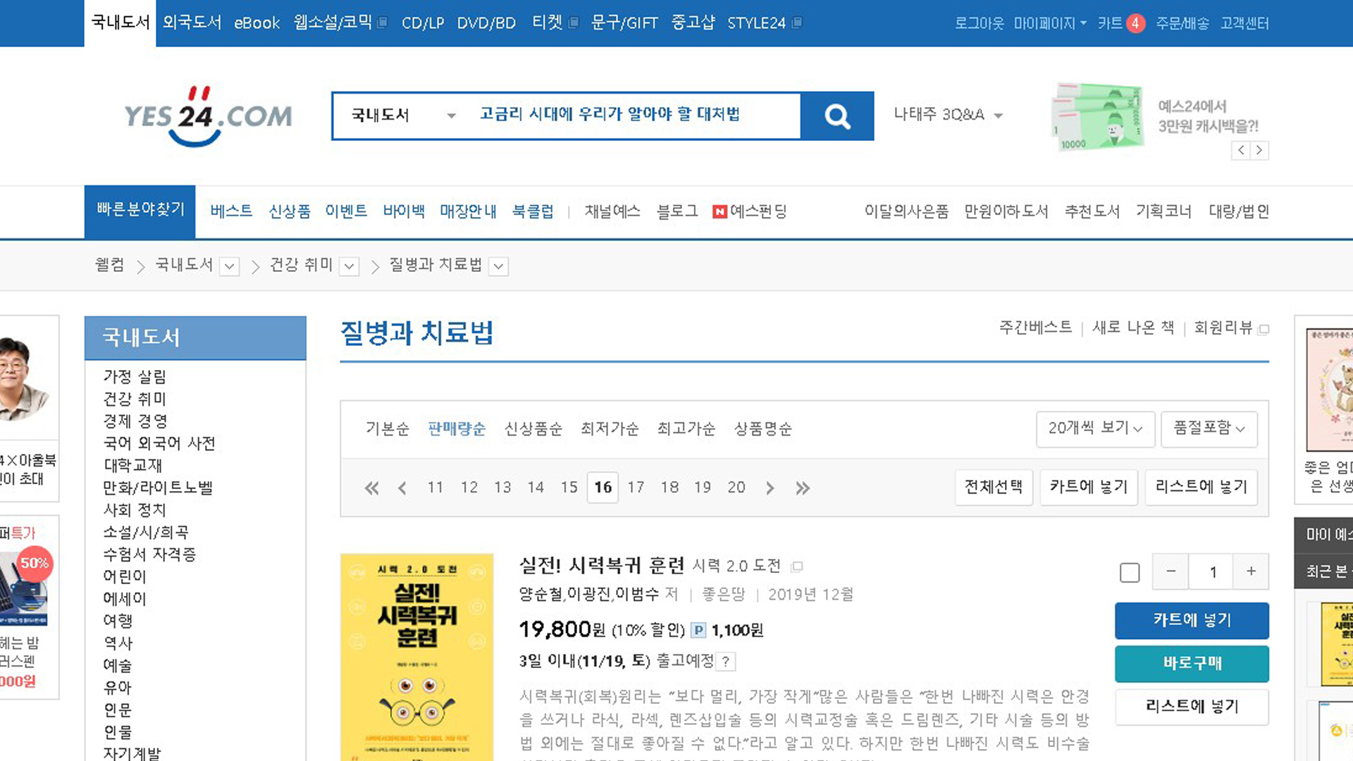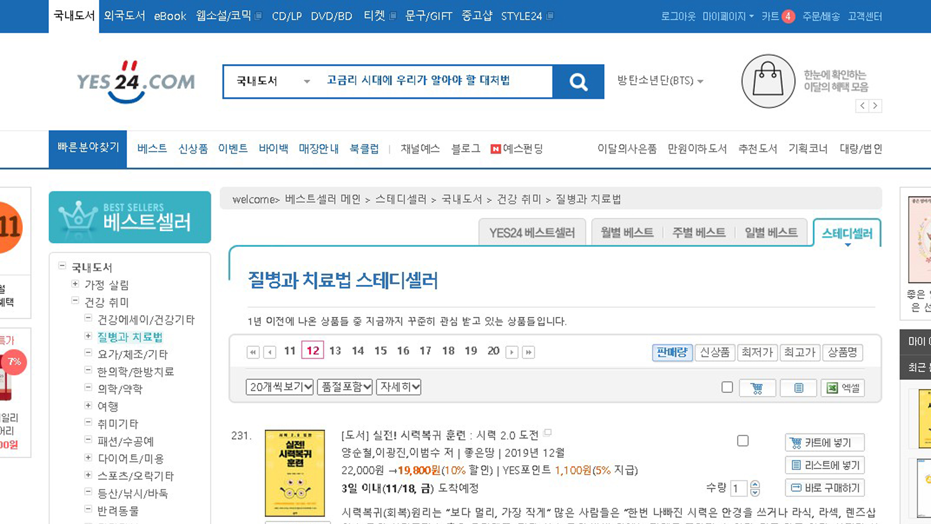 실전시력복귀훈련 예스24 2022년 11월 3주 17일 질병과치료법 판매량순 베스트셀러 318위 스테디셀러 231위 TOP100 18주