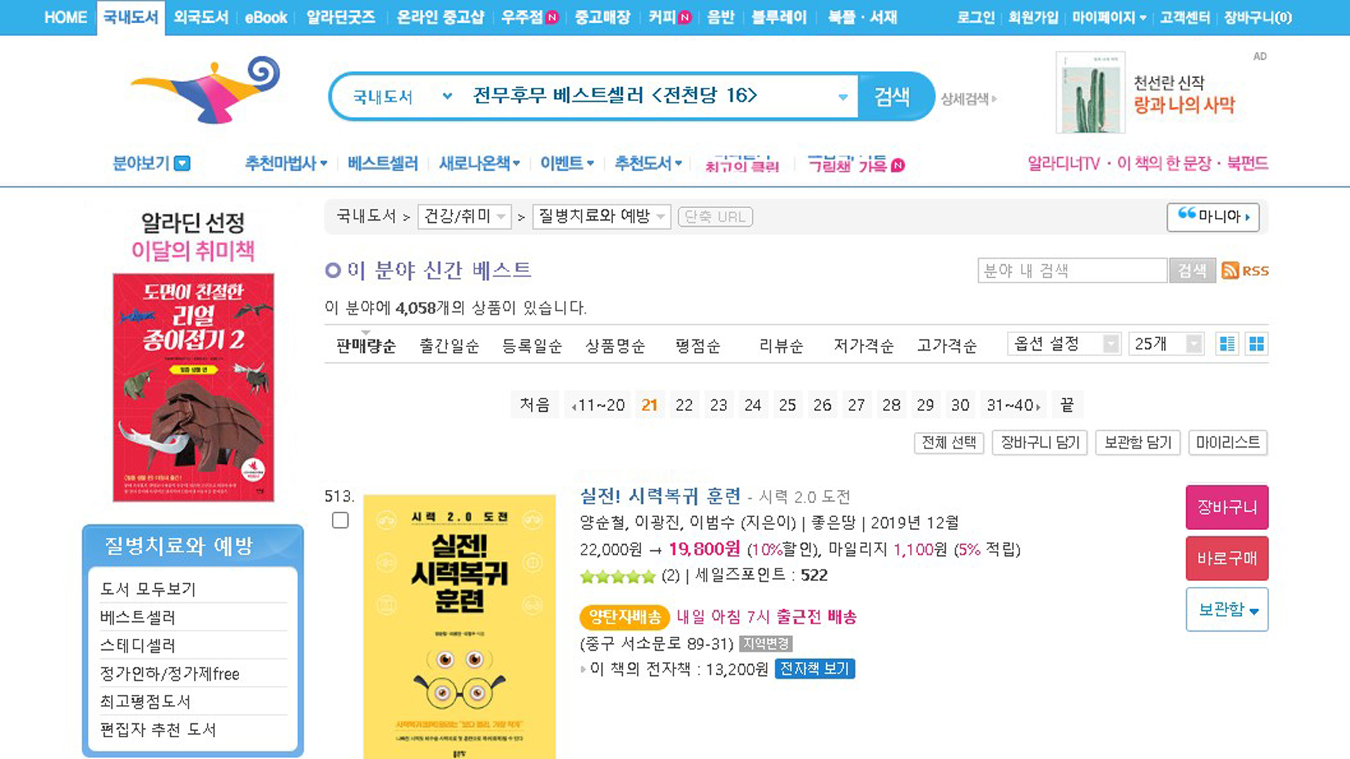 실전시력복귀훈련 알라딘 베스트셀러 2022년 11월 3주 17일 질병치료와예방 베스트셀러 513위입니다.