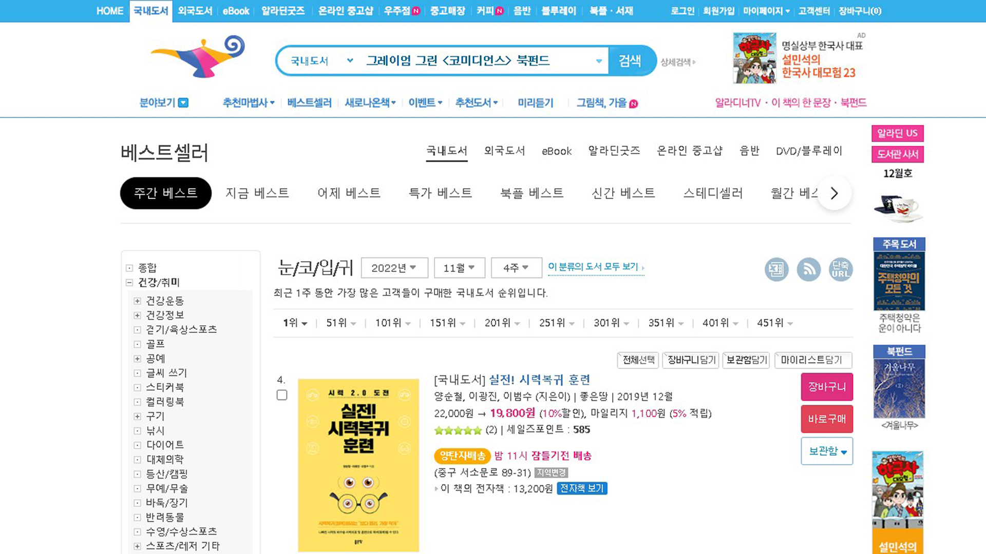 실전시력복귀훈련 알라딘 베스트셀러 2022년 12월 4주 30일 질병치료와예방 베스트셀러 96위입니다.