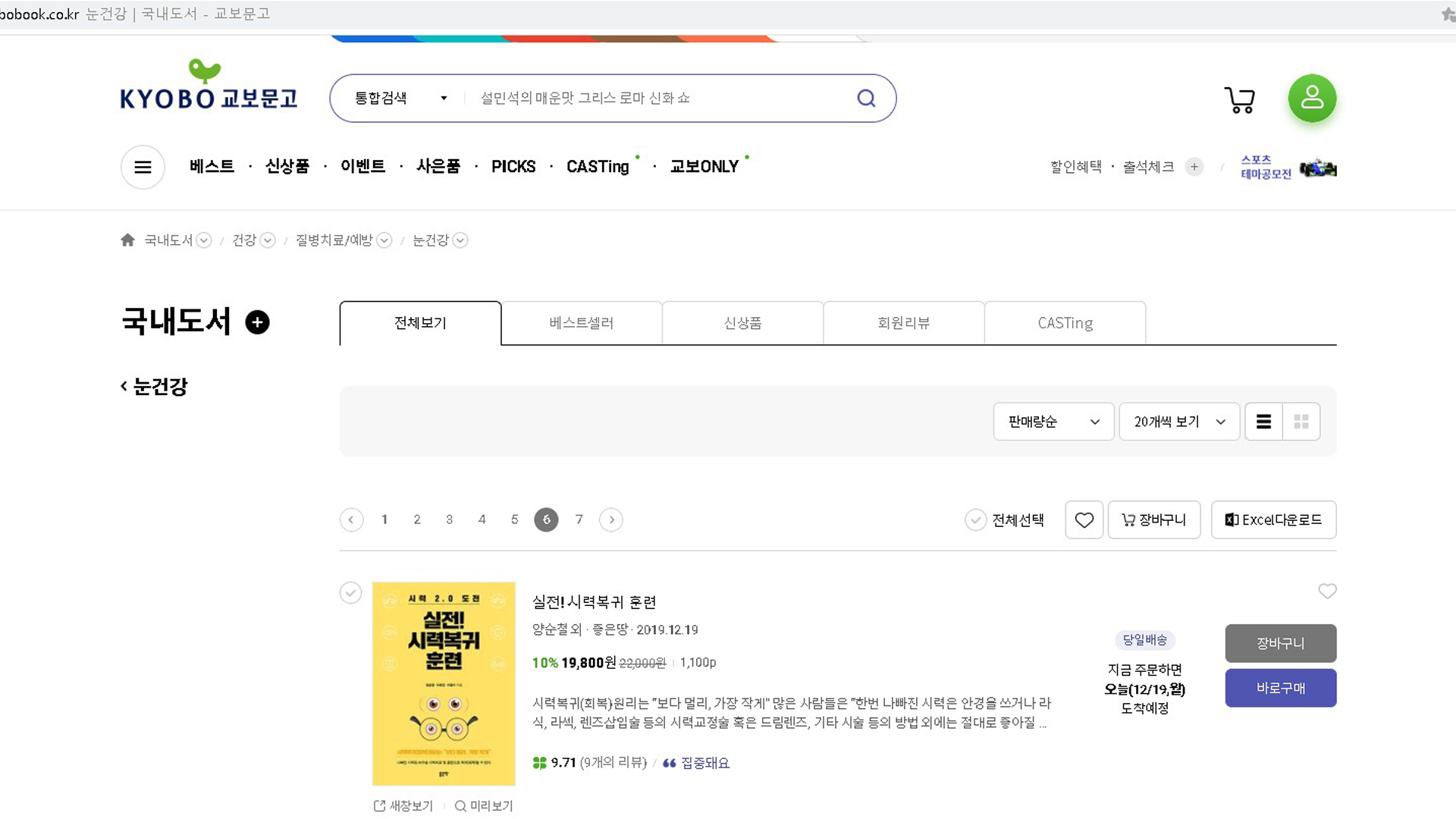실전시력복귀훈련 교보문고 베스트셀러 2022년 12월 3주 18일 눈건강 판매량순 106위입니다.