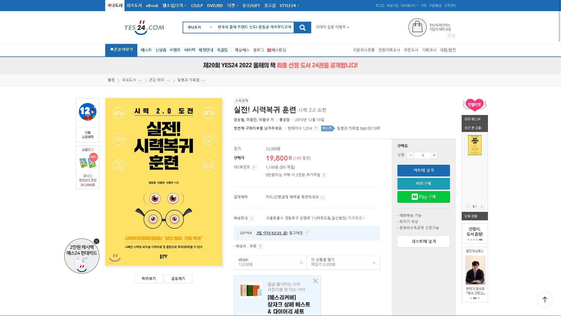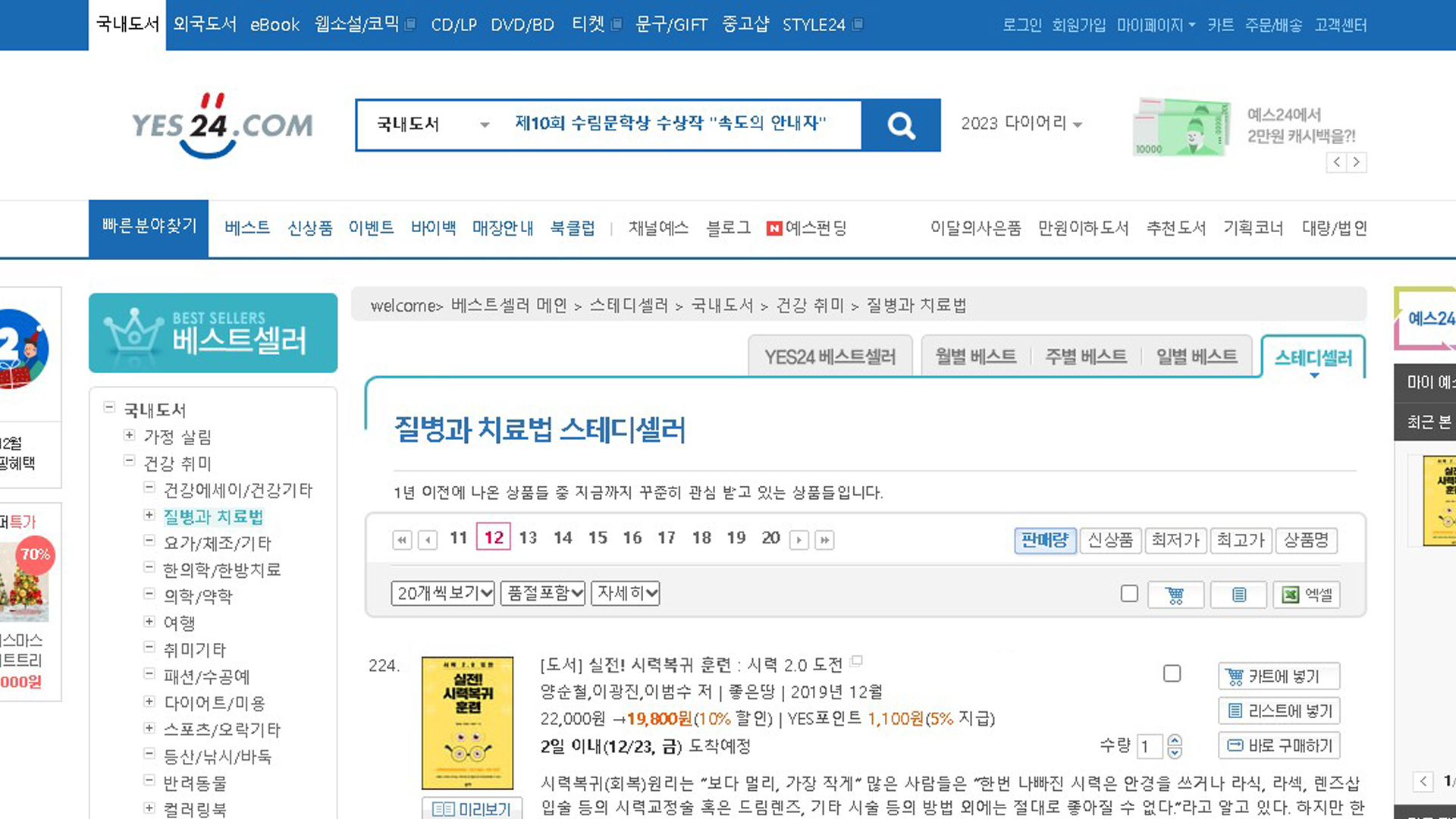 실전시력복귀훈련 예스24 2022년 12월 3주 21일 질병과치료법 베스트셀러 188위 스테디셀러 224위 TOP100 18주