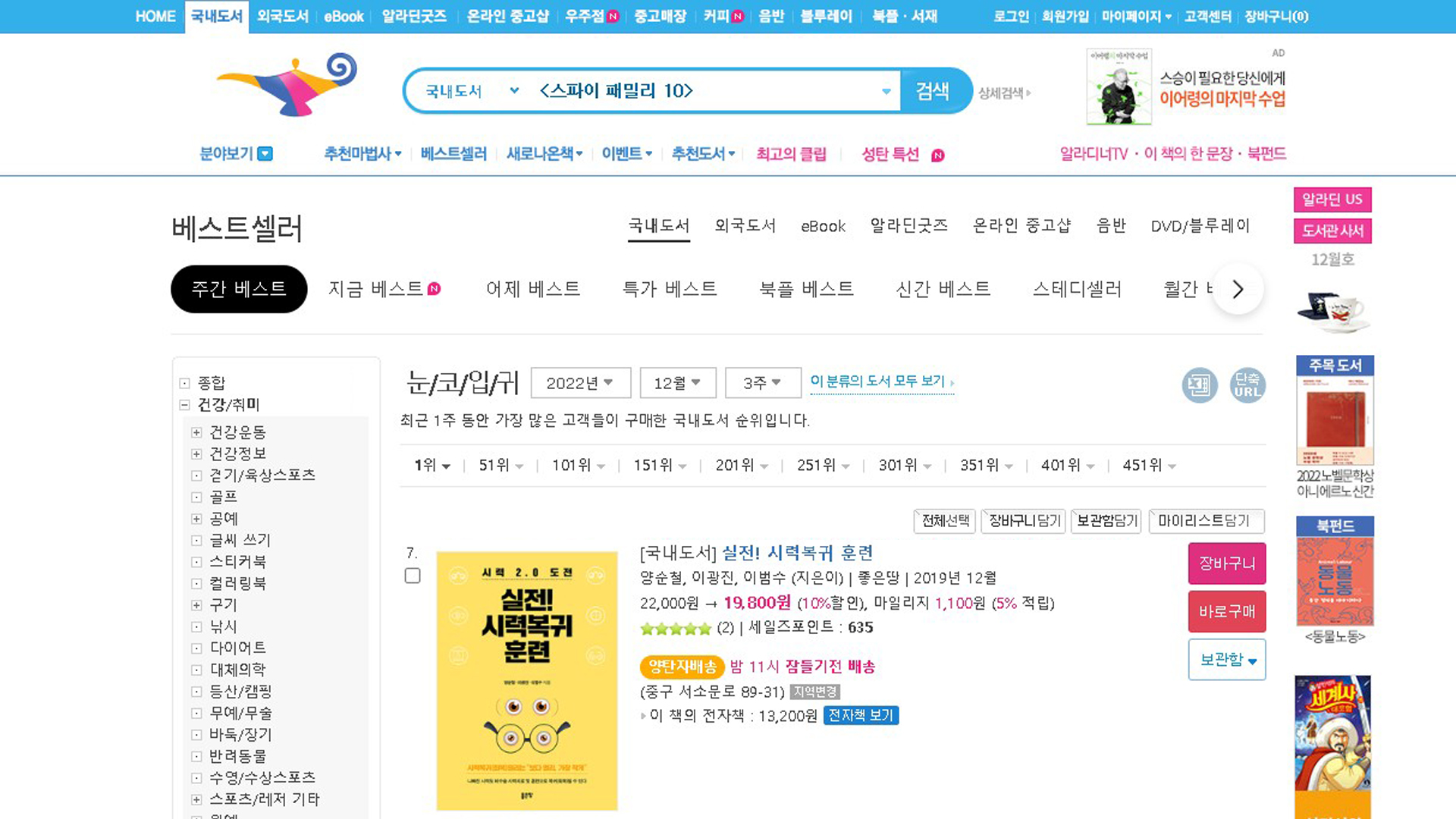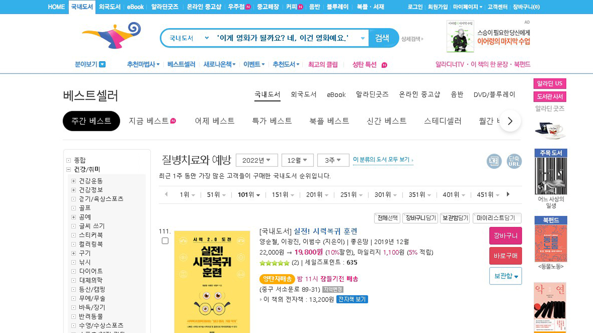 실전시력복귀훈련 알라딘 베스트셀러 2022년 12월 3주 21일 주간 베스트셀러 111위입니다.