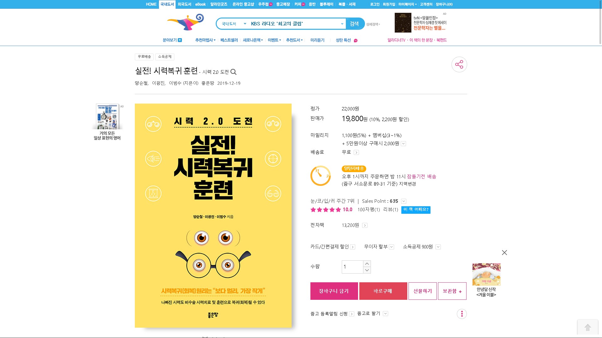 실전시력복귀훈련 알라딘 베스트셀러 2022년 12월 3주 21일 질병치료와예방 베스트셀러 111위, 눈코입귀 베스트셀러 7위