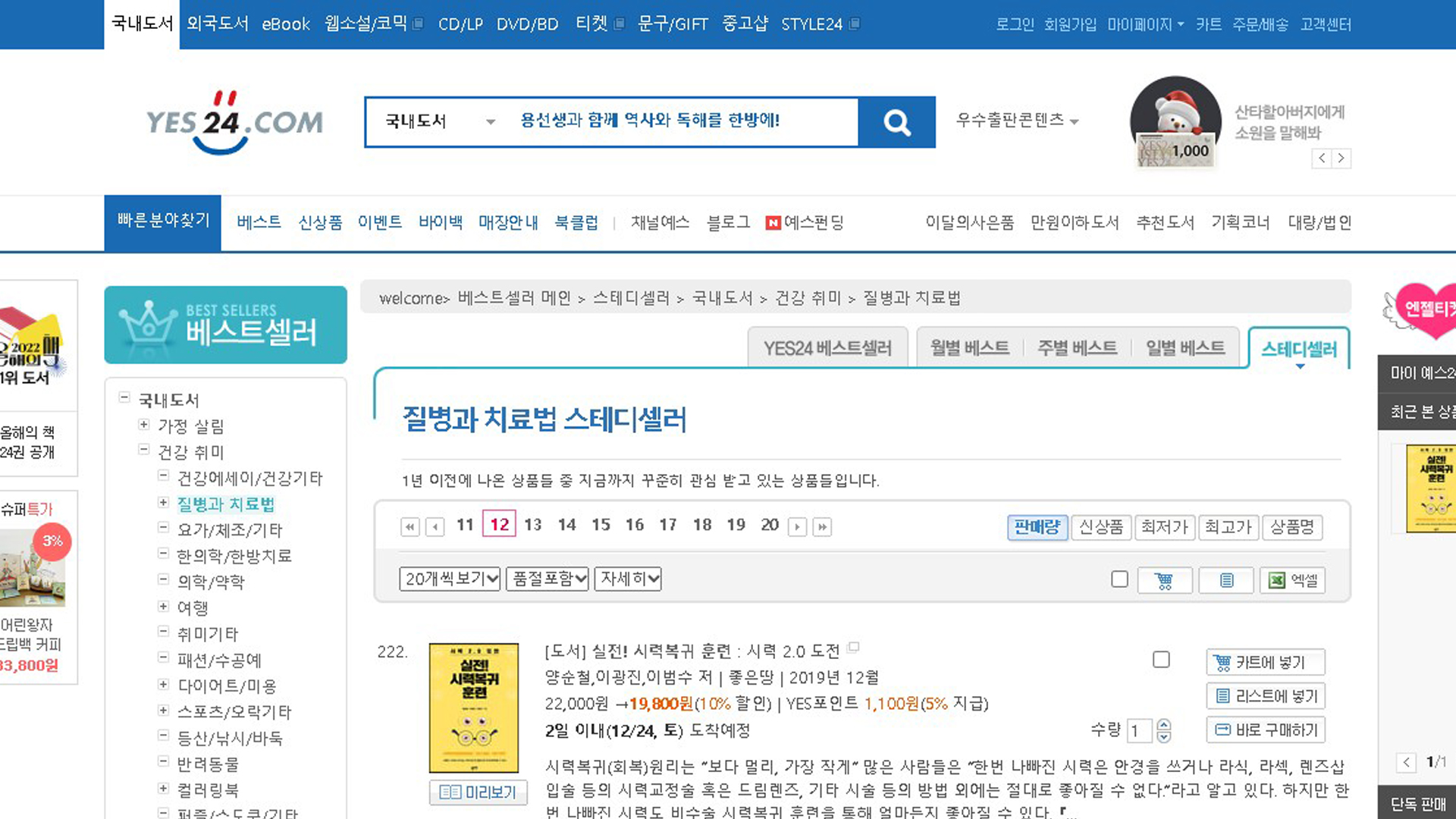 실전시력복귀훈련 예스24 2022년 12월 3주 22일 질병과치료법 베스트셀러 188위 스테디셀러 222위 TOP100 18주