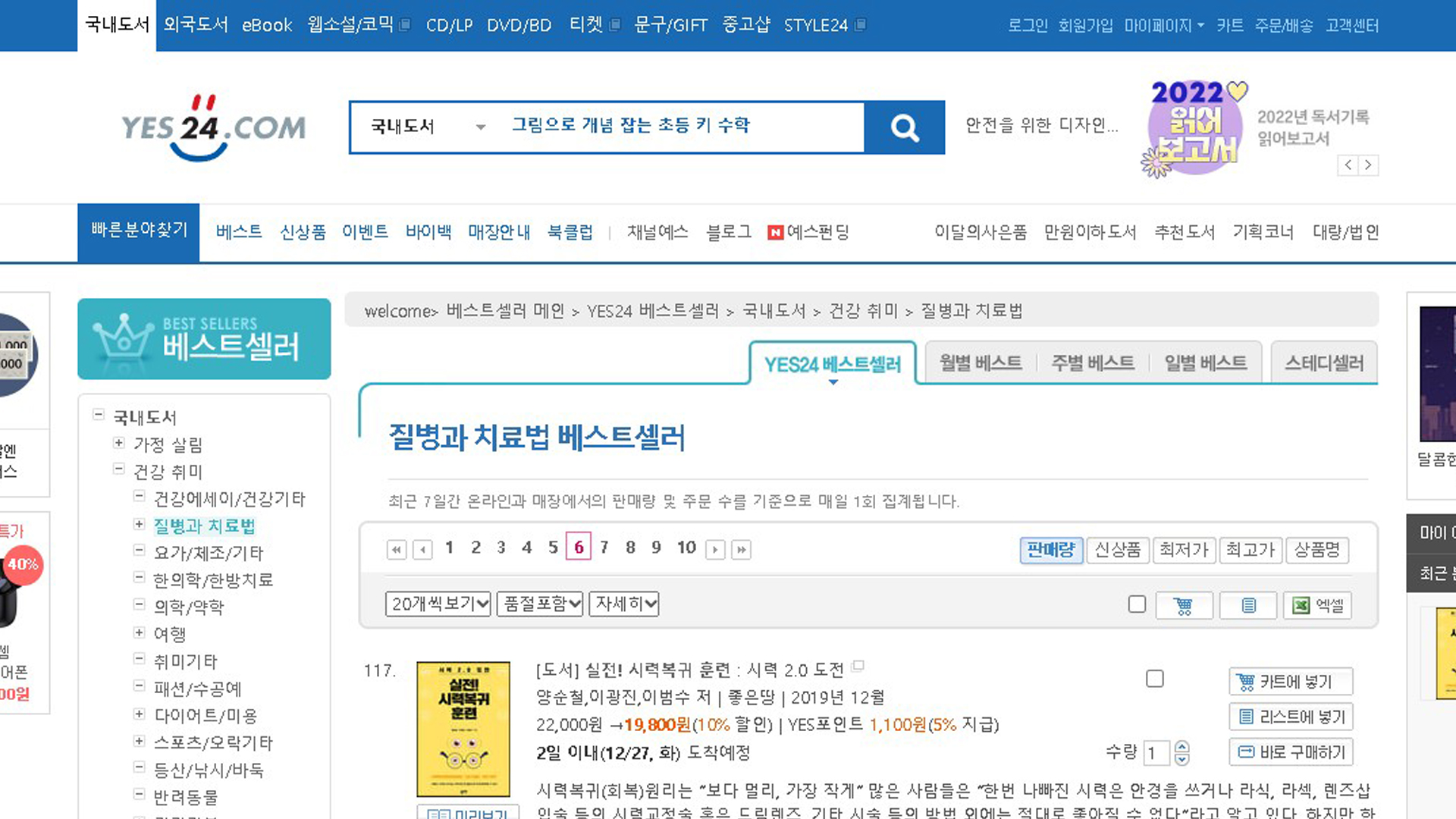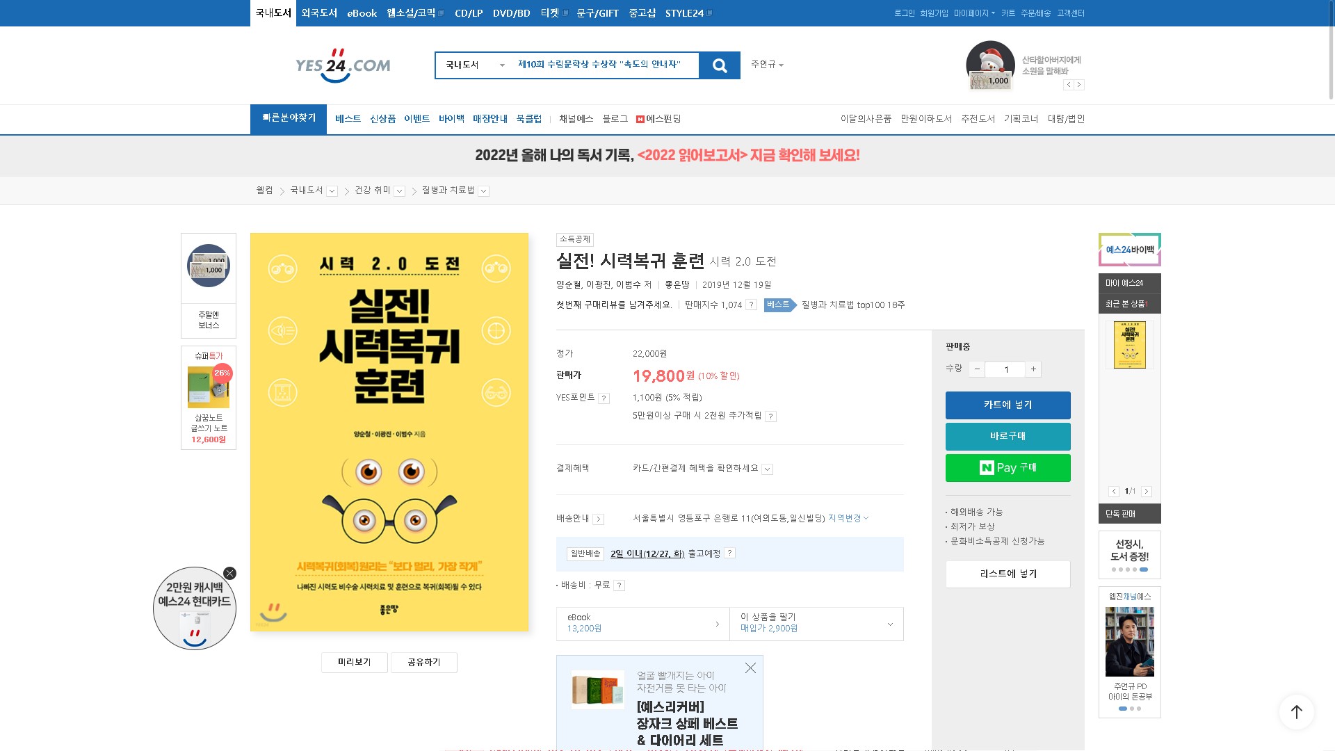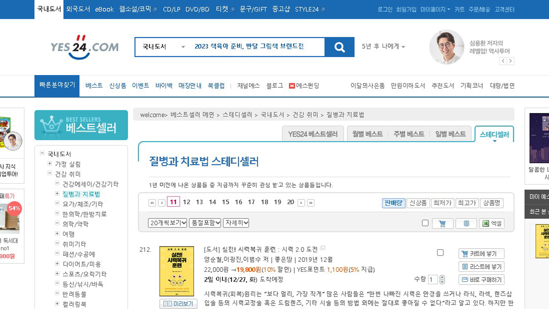 실전시력복귀훈련 예스24 2022년 12월 4주 26일 질병과치료법 베스트셀러 117위 스테디셀러 212위 TOP100 18주