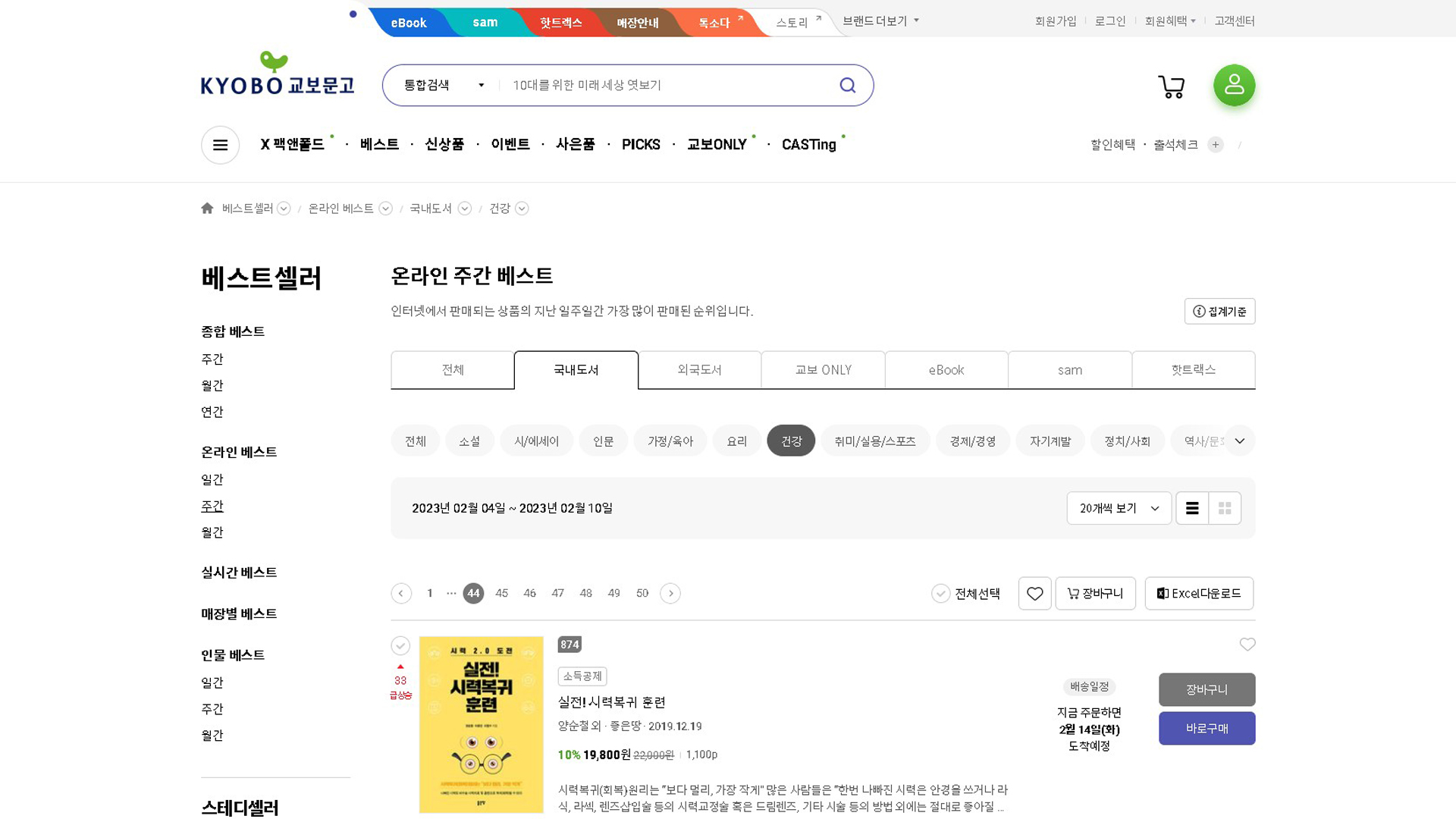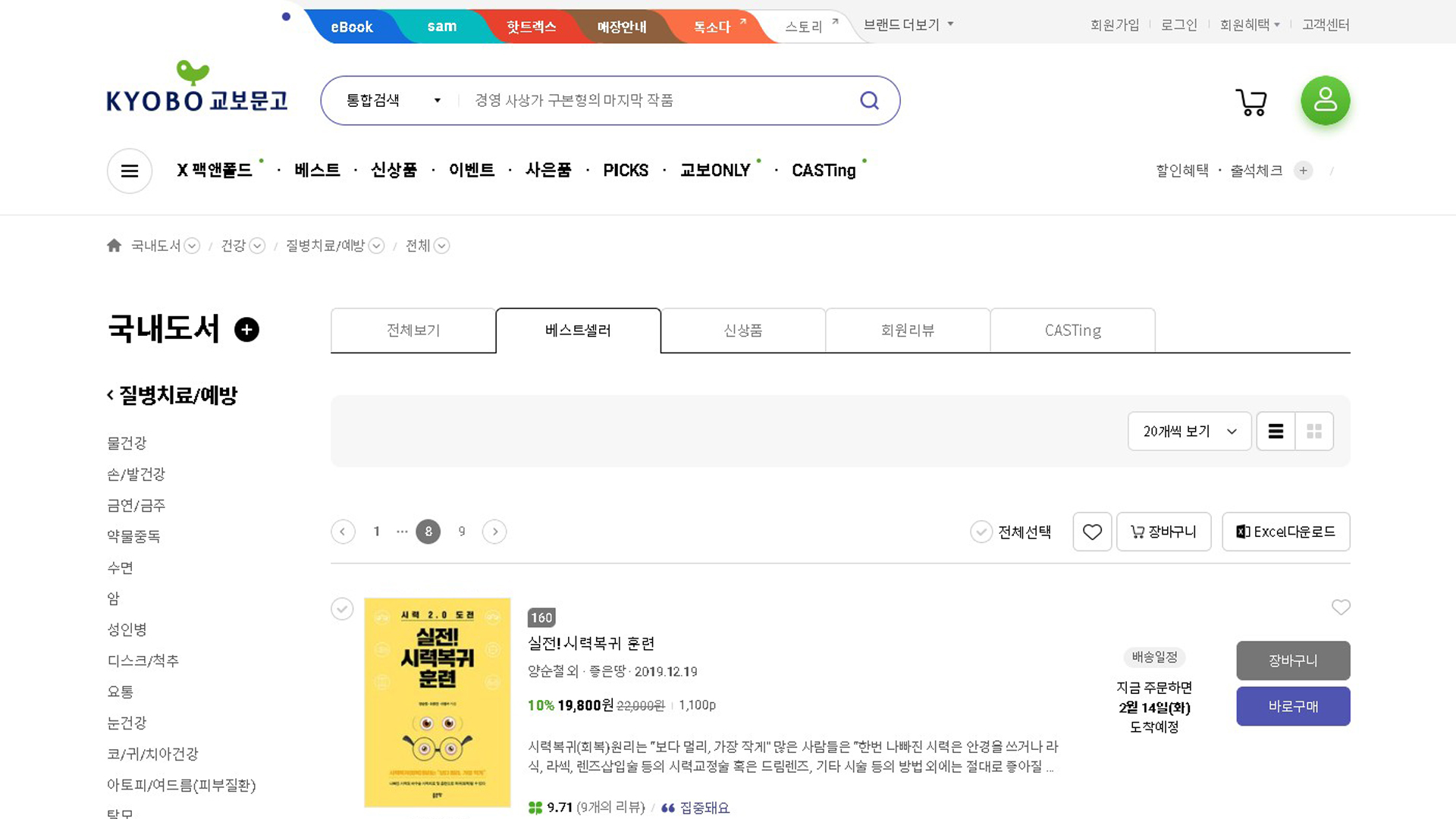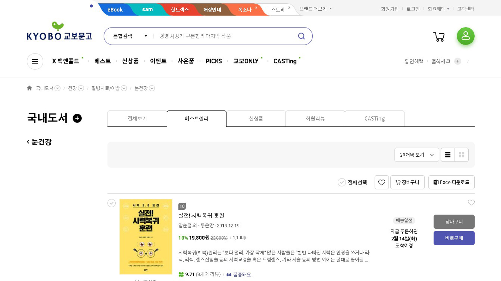 실전시력복귀훈련 교보문고 베스트셀러 2022년 2월 1주 11일 질병 치료 예방 베스트셀러 160위입니다.