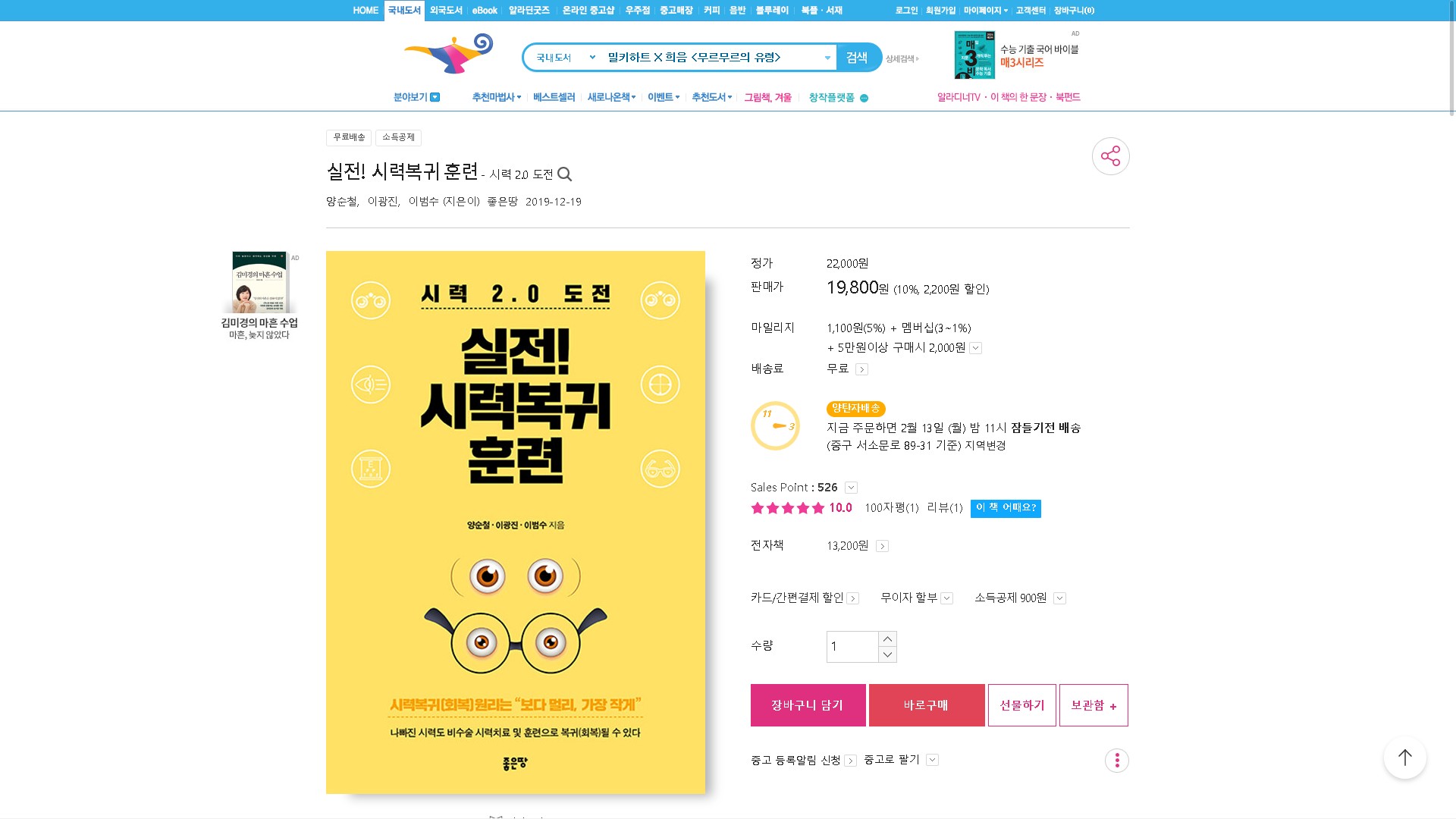 실전시력복귀훈련 알라딘 베스트셀러 2023년 2월 1주 11일 신간 베스트셀러 544위입니다.