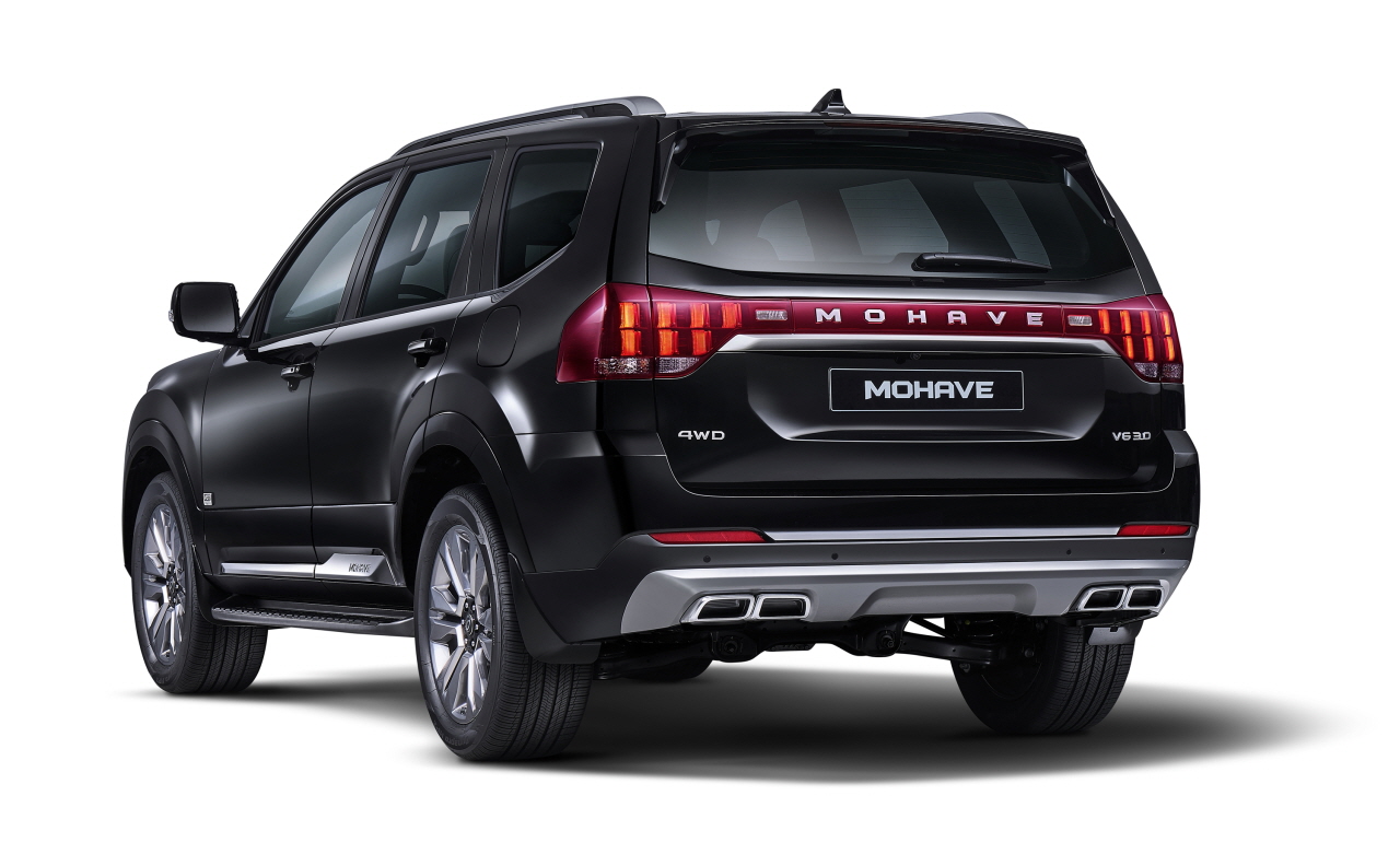 후면부는 ▲전면부와 통일감 있는 버티컬 큐브 리어 램프 ▲플래그십 SUV 다운 든든함과 고급스러움을 보여주는 듀얼 트윈팁 데코 가니쉬 ▲모하비 전용 고급스러운 엠블럼을 적용해 안정감 있는 대형 SUV의 면모를 자랑한다.