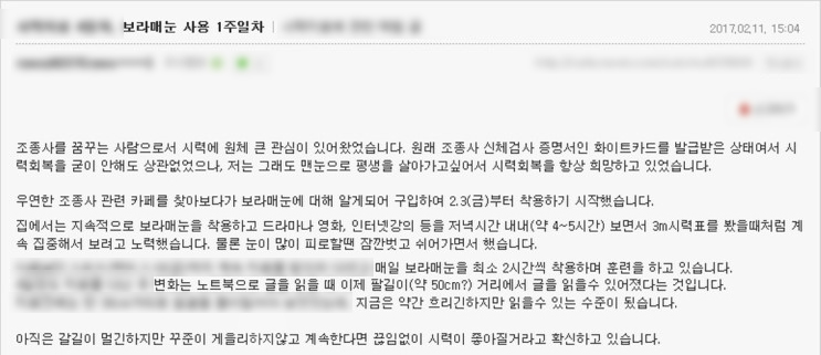 [보라매눈 체험 후기/시력 운동 훈련 사례 기타4](실제체험후기) 조종사 지망생 시력치료 4일차, 보라매눈 시력 운동 4일 만에 근거리 50cm 읽기 가능 나안 0.5(–1디옵터 수준) - 눈 시력좋아지는법