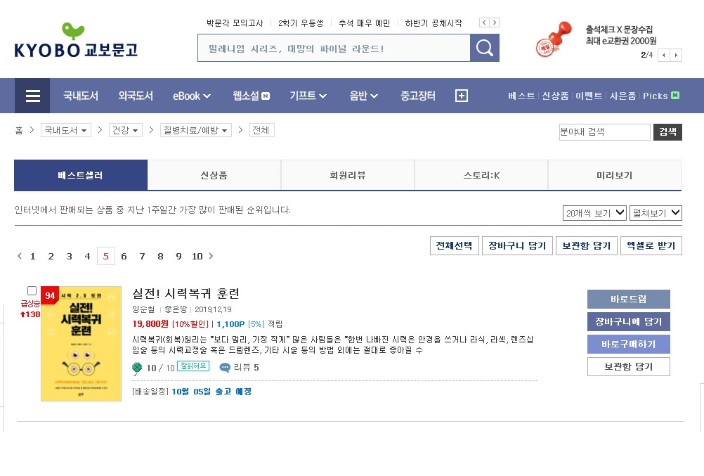 실전!시력복귀훈련 교보문고 2020년 9월 3주차 건강>질병치료/예방 관련 주간 베스트셀러 94위