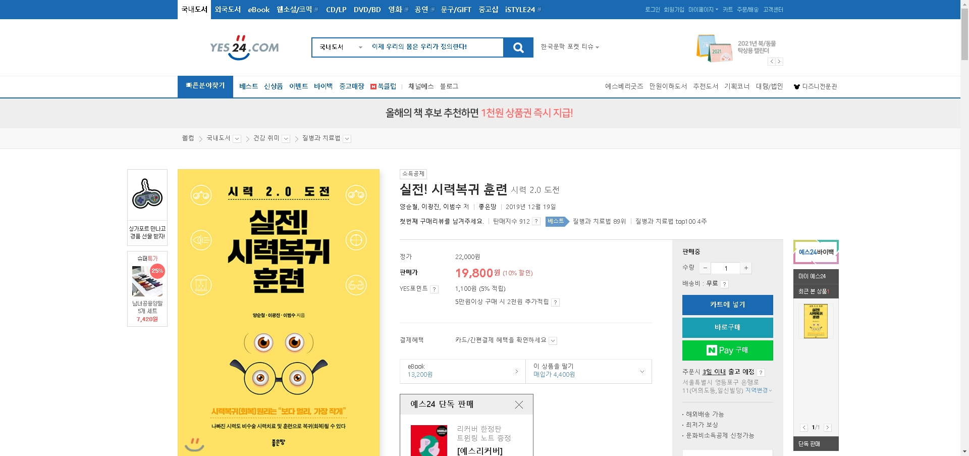 실전!시력복귀훈련 예스24 2020년 11월 1주차 질병과치료법 관련 주간 베스트셀러 89위