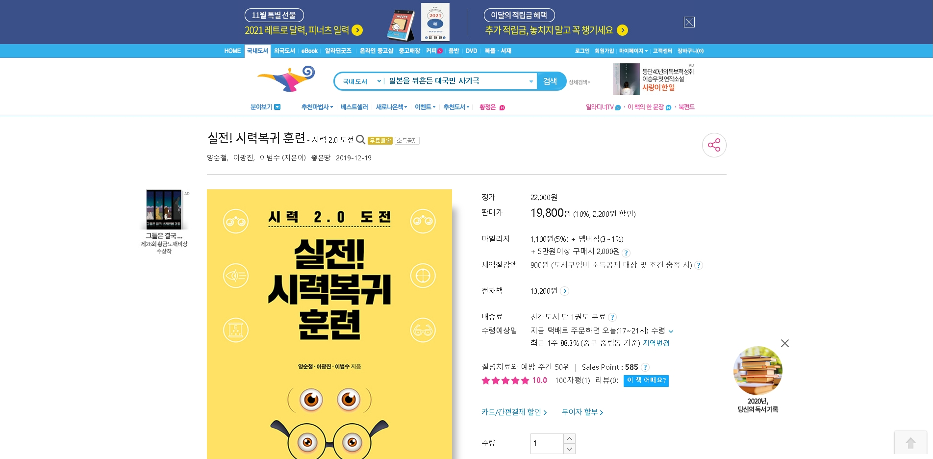실전!시력복귀훈련 알라딘 2020년 11월 11일 질병치료와예방 관련 주간 베스트셀러 50위