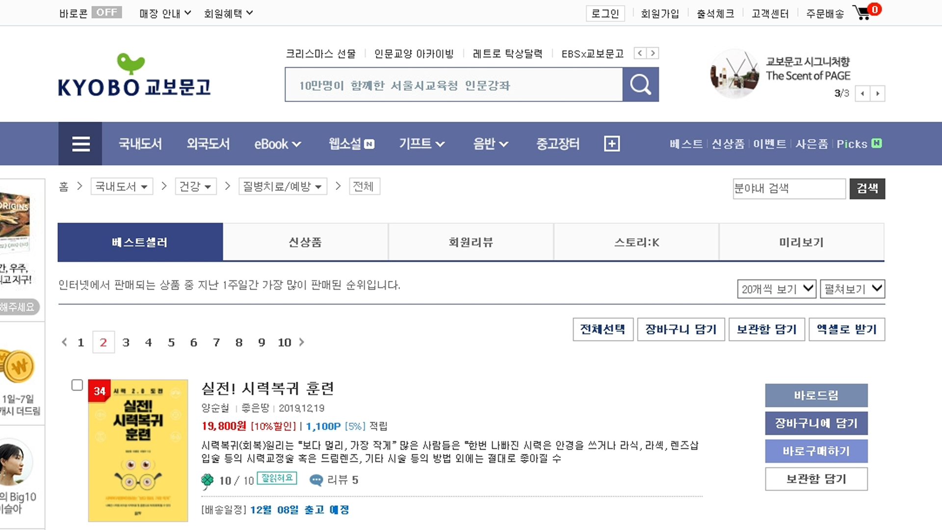 이틀 만에 책 실전!시력복귀훈련이 교보문고 베스트셀러 34위입니다.