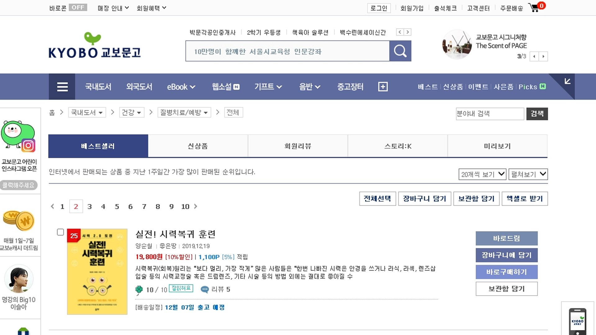 실전!시력복귀훈련이 교보문고 2020년 12월 1주 5일 질병치료/예방 관련 베스트셀러 25위에 올랐습니다.