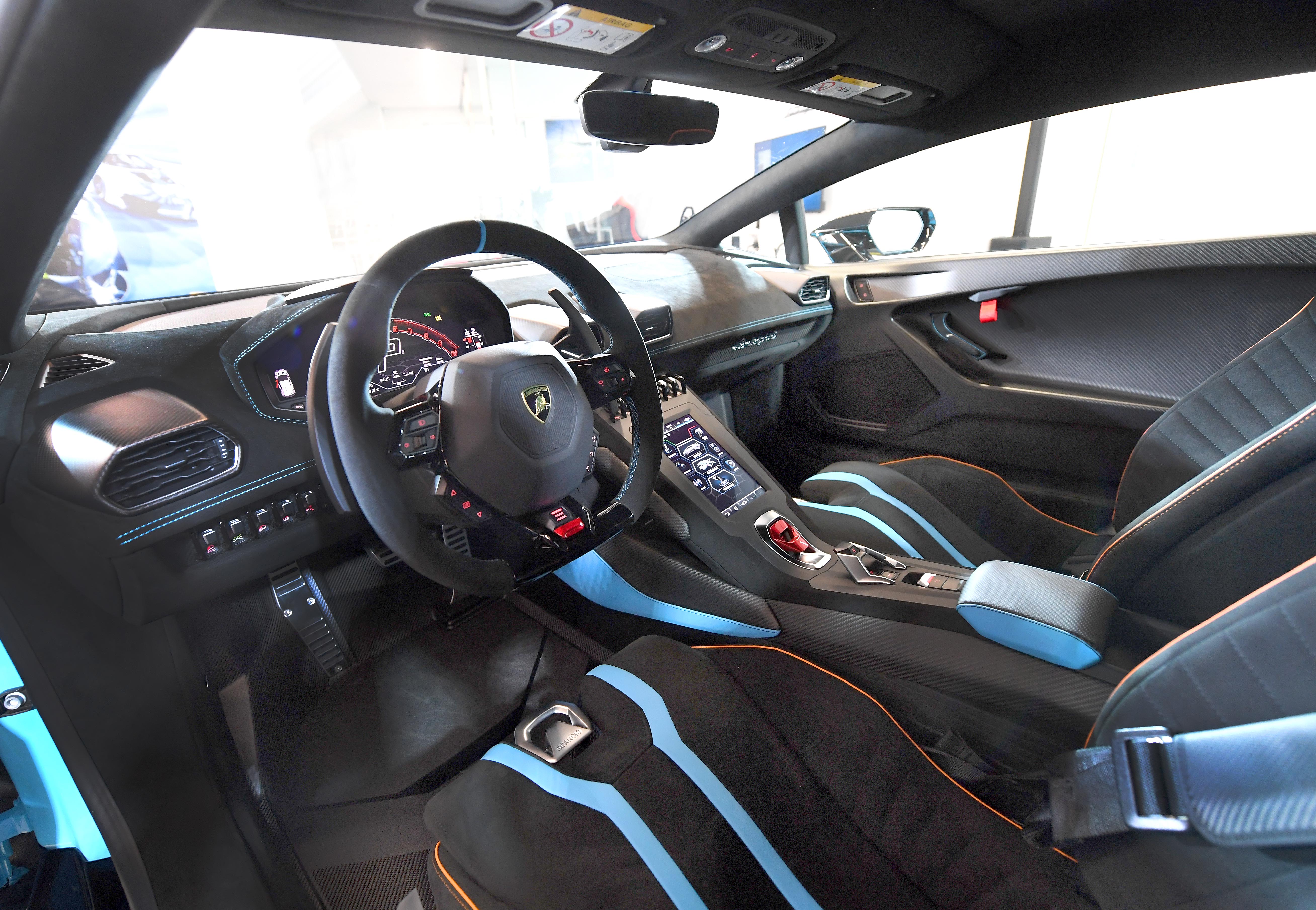 우라칸 STO의 실내는 람보르기니 카본 스킨과 조화를 이룬 알칸타라 소재, 카펫을 대체한 탄소 섬유 바닥 매트, 스포츠 시트 전체를 비롯해 실내 전반에 탄소 섬유를 폭넓게 사용함으로써 외부의 경량 특성을 그대로 반영하고 있다. 4점식 안전벨트가 있는 롤 바와 헬멧 수납공간으로 새로 설계한 앞 트렁크는 우라칸 STO의 레이싱 DNA를 강조한다.