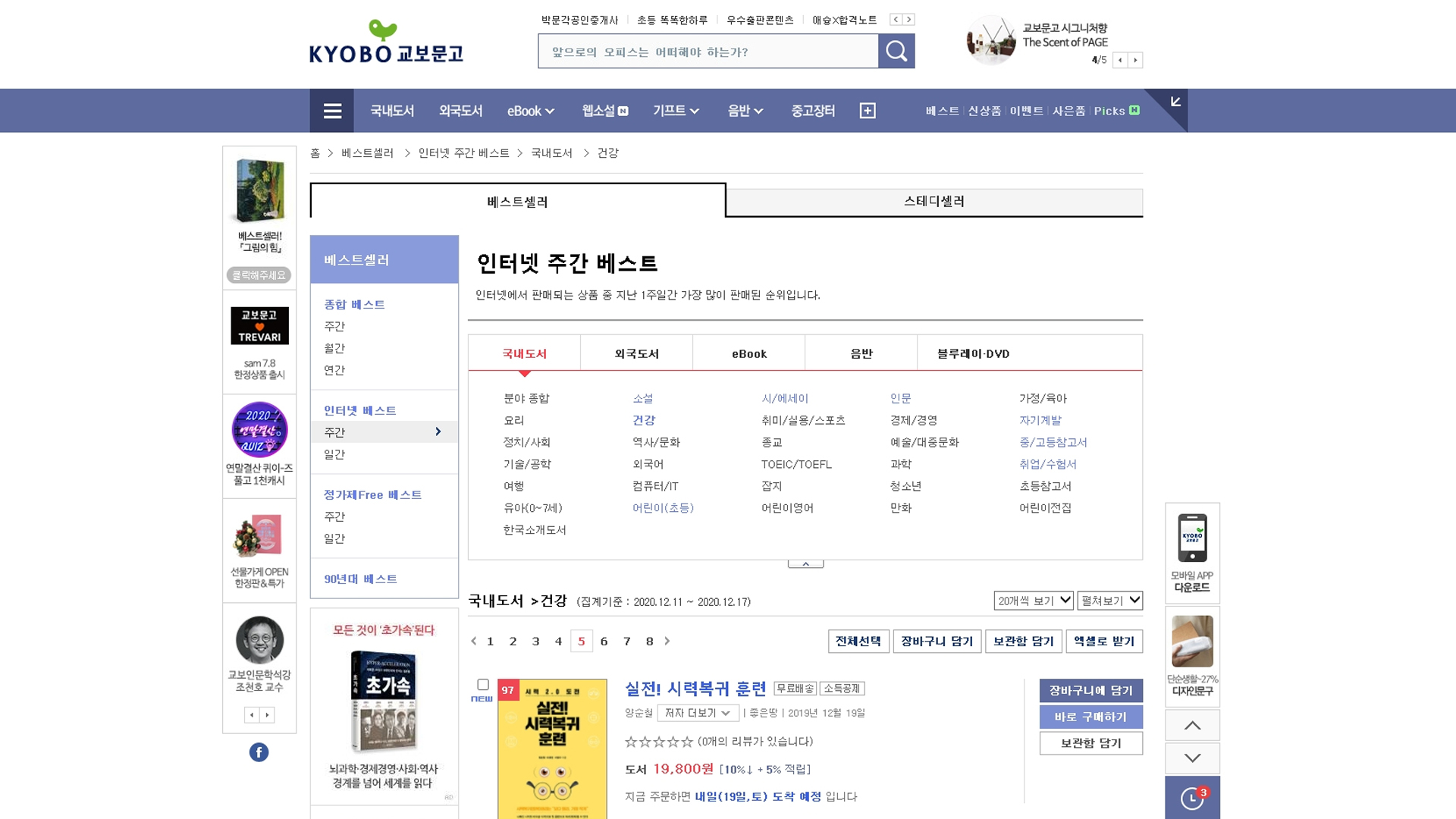 실전!시력복귀훈련 교보문고 2020년 12월 2주 18일 베스트셀러 건강 주간 베스트 97위, 베스트셀러 질병치료/예방 15위, 눈건강 카테고리에서는 2위입니다.