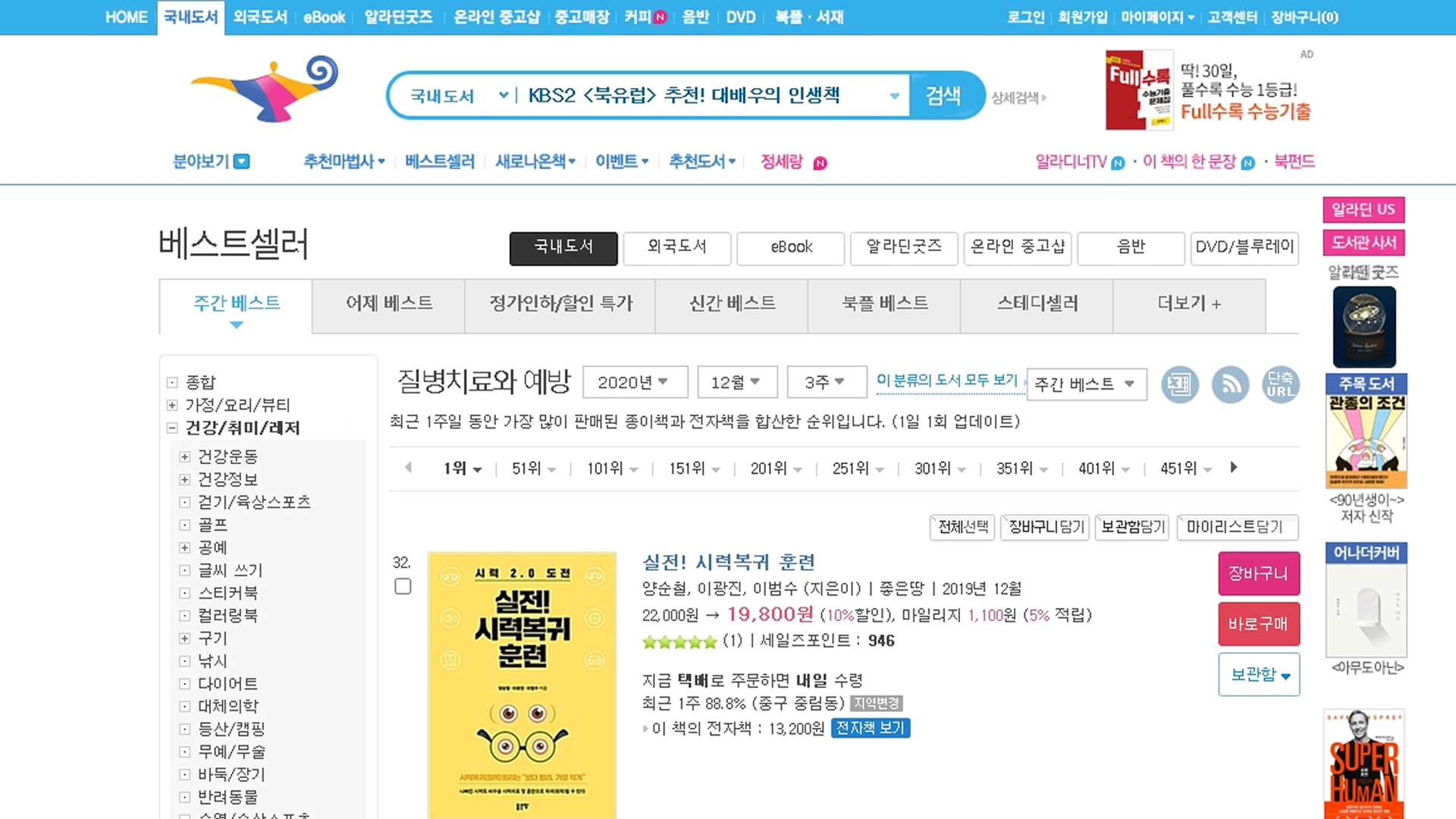 책 실전!시력복귀훈련이 12월 3주 알라딘 질병치료와예방 주간 베스트셀러 32위입니다.
