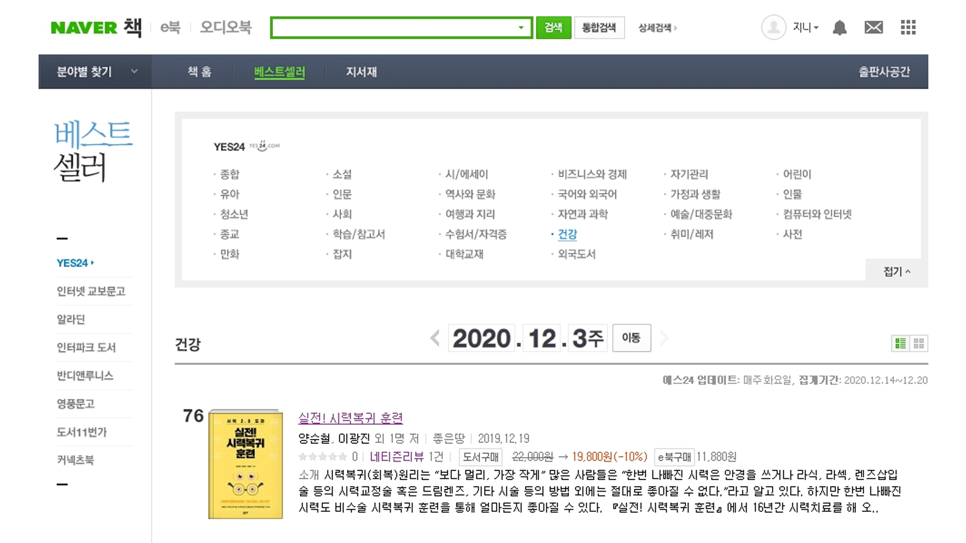 실전!시력복귀훈련 예스24 2020년 12월 3주 22일 질병과치료법 관련 주간 베스트셀러 39위, 네이버 책 예스24 건강 주간 베스트셀러 76위.