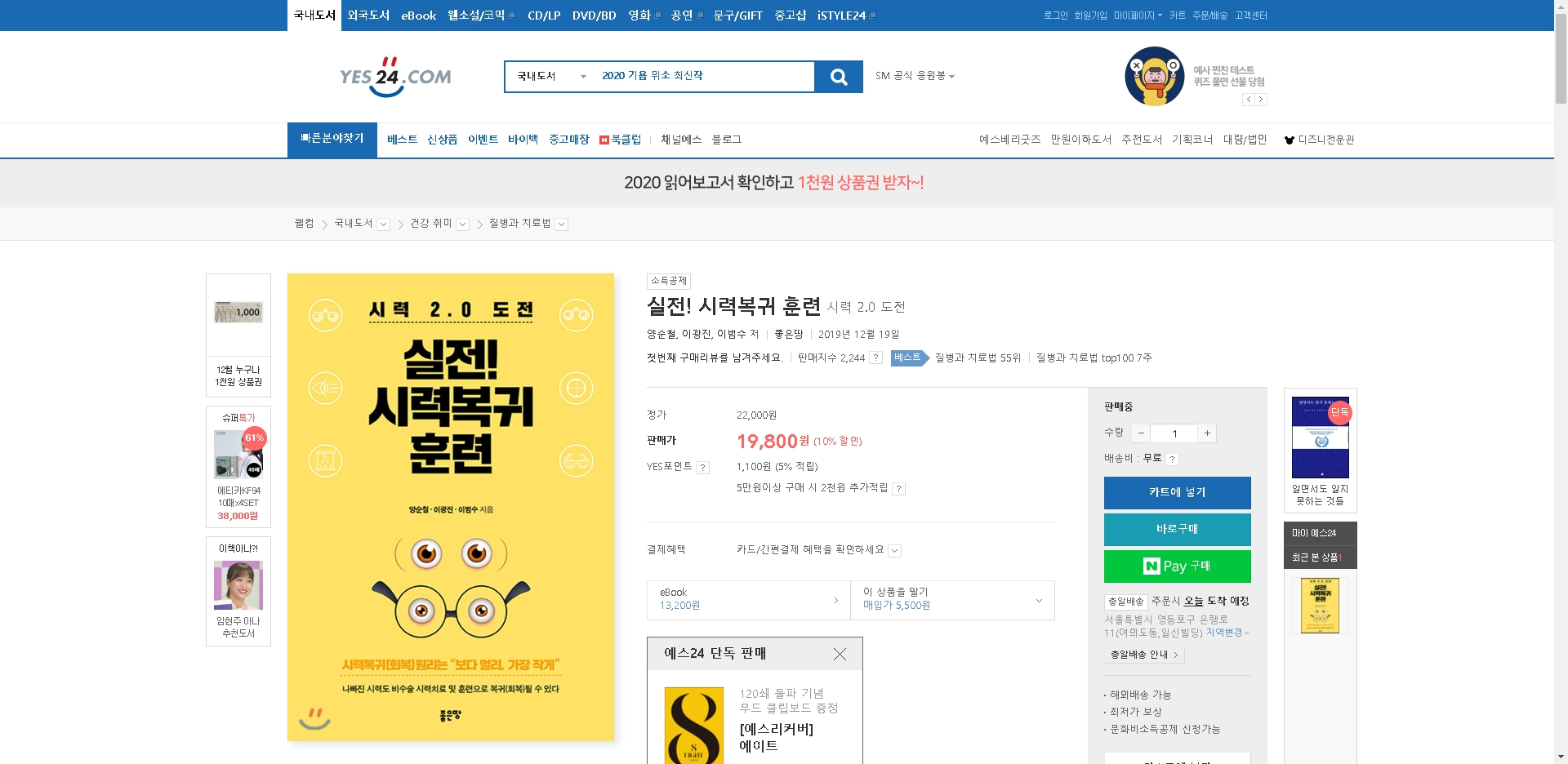 [베스트셀러]실전!시력복귀훈련 예스24 2020년 12월 3주 24일 베스트셀러 질병과치료법 55위 TOP100 7주 네이버 책 베스트셀러 눈시력좋아지는법/눈운동/눈좋아지는책/온가족이 함께 하는 시력복귀..