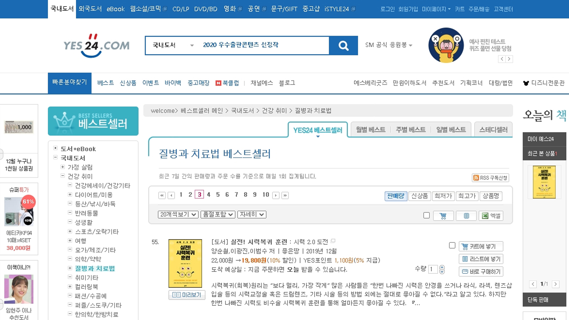 실전!시력복귀훈련이 예스24 2020년 12월 3주 24일 질병과치료법 관련 베스트셀러 55위에 올랐습니다.