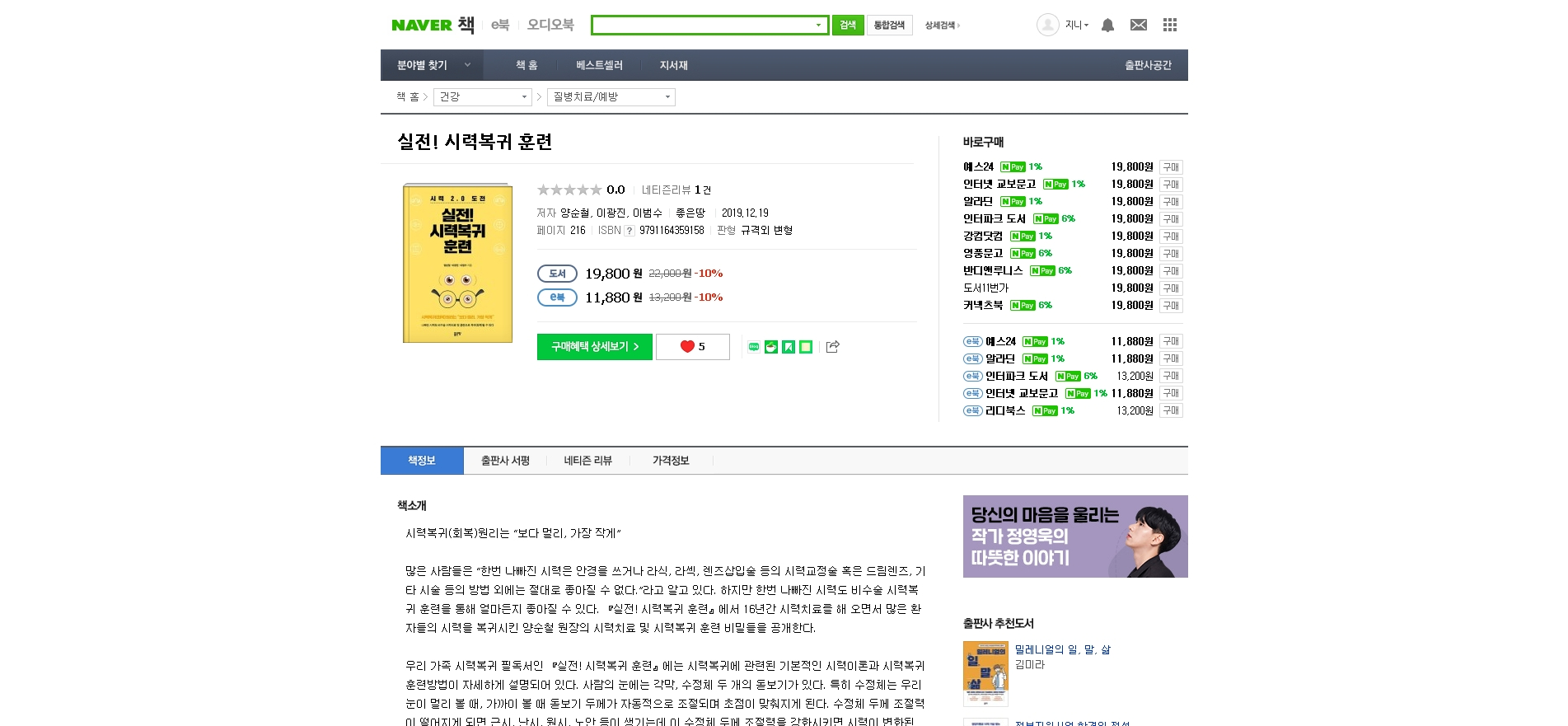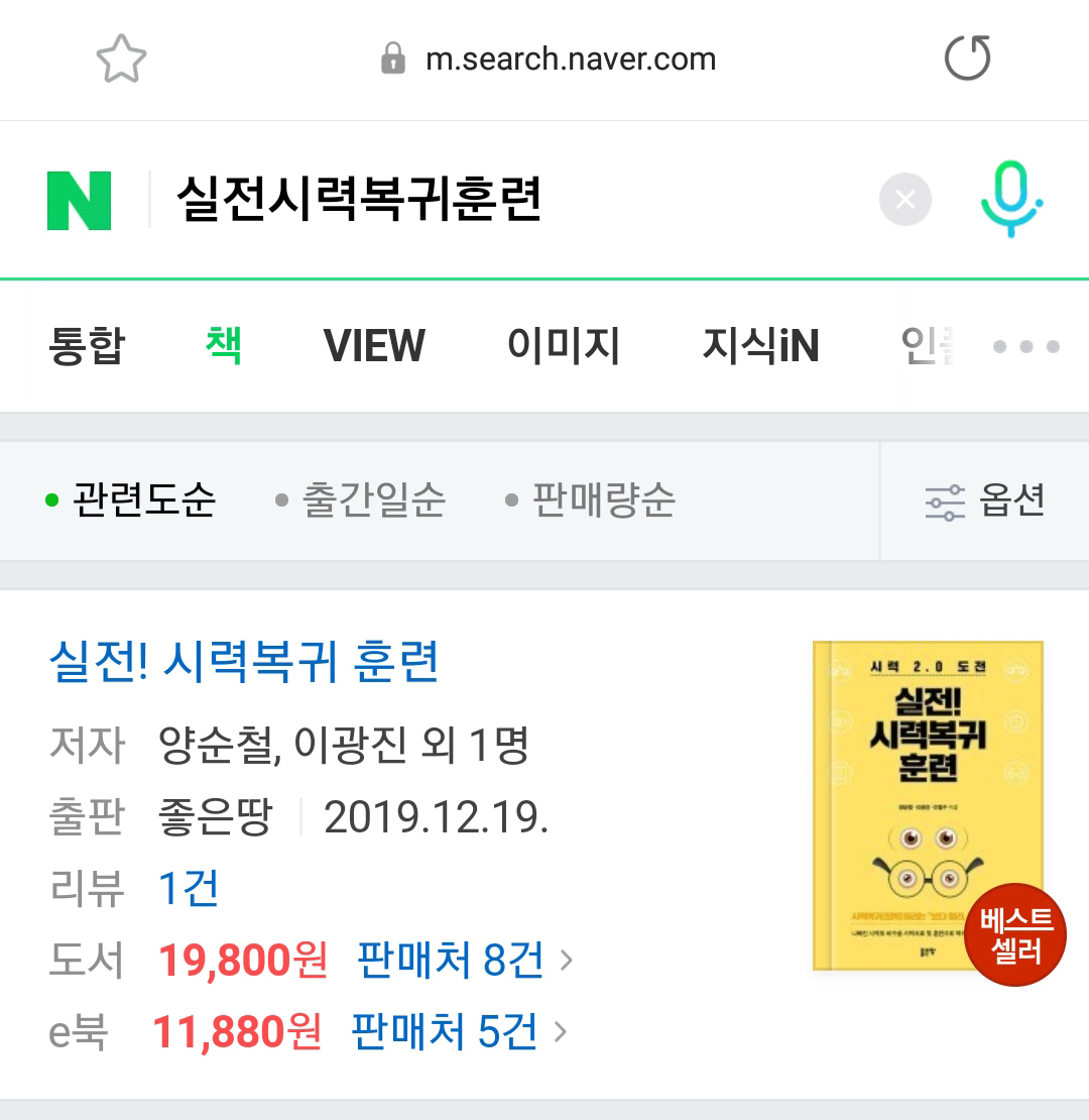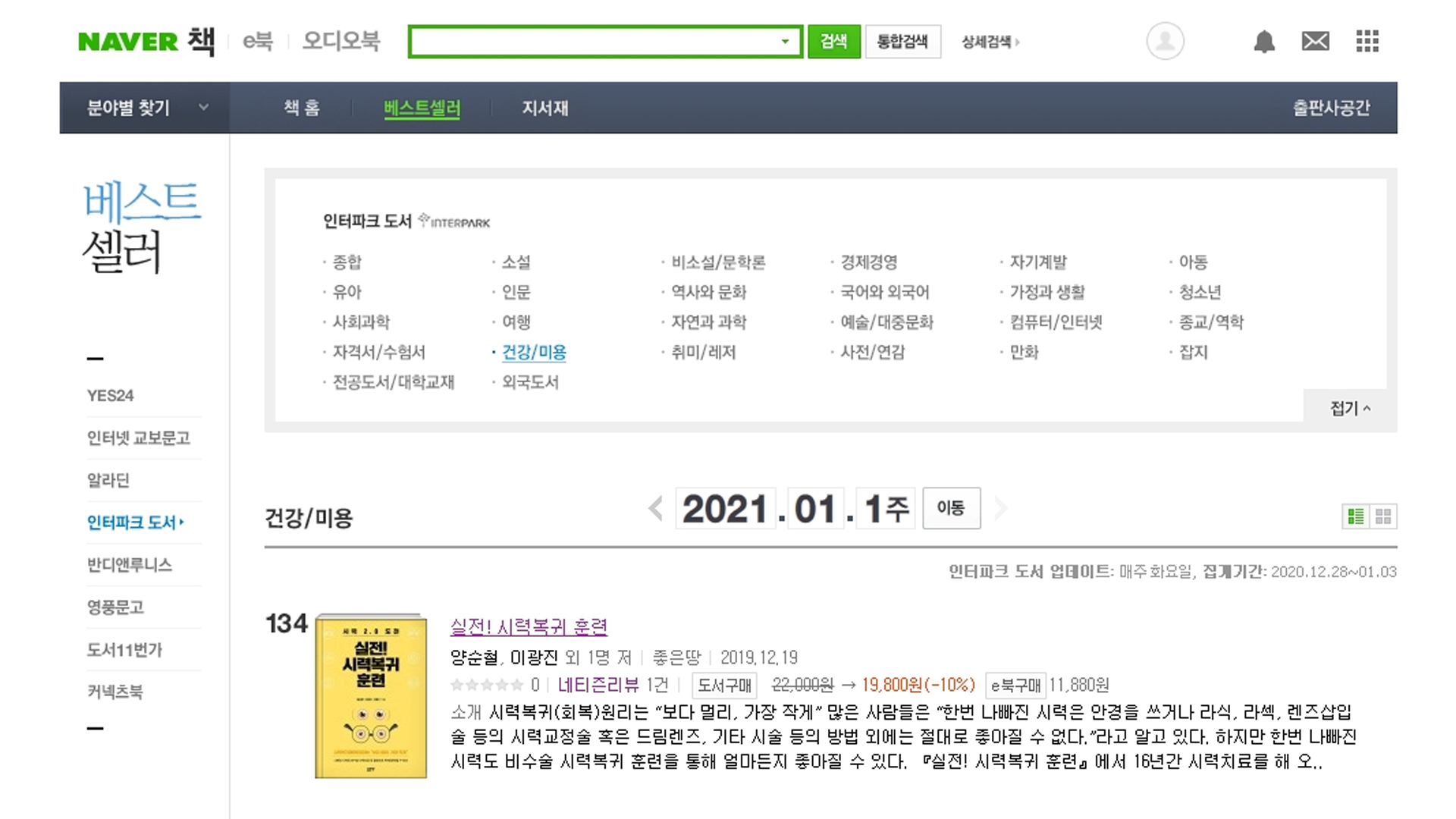 책 실전!시력복귀훈련이 네이버 책 인터파크 주간 베스트셀러 건강/미용 134위입니다.