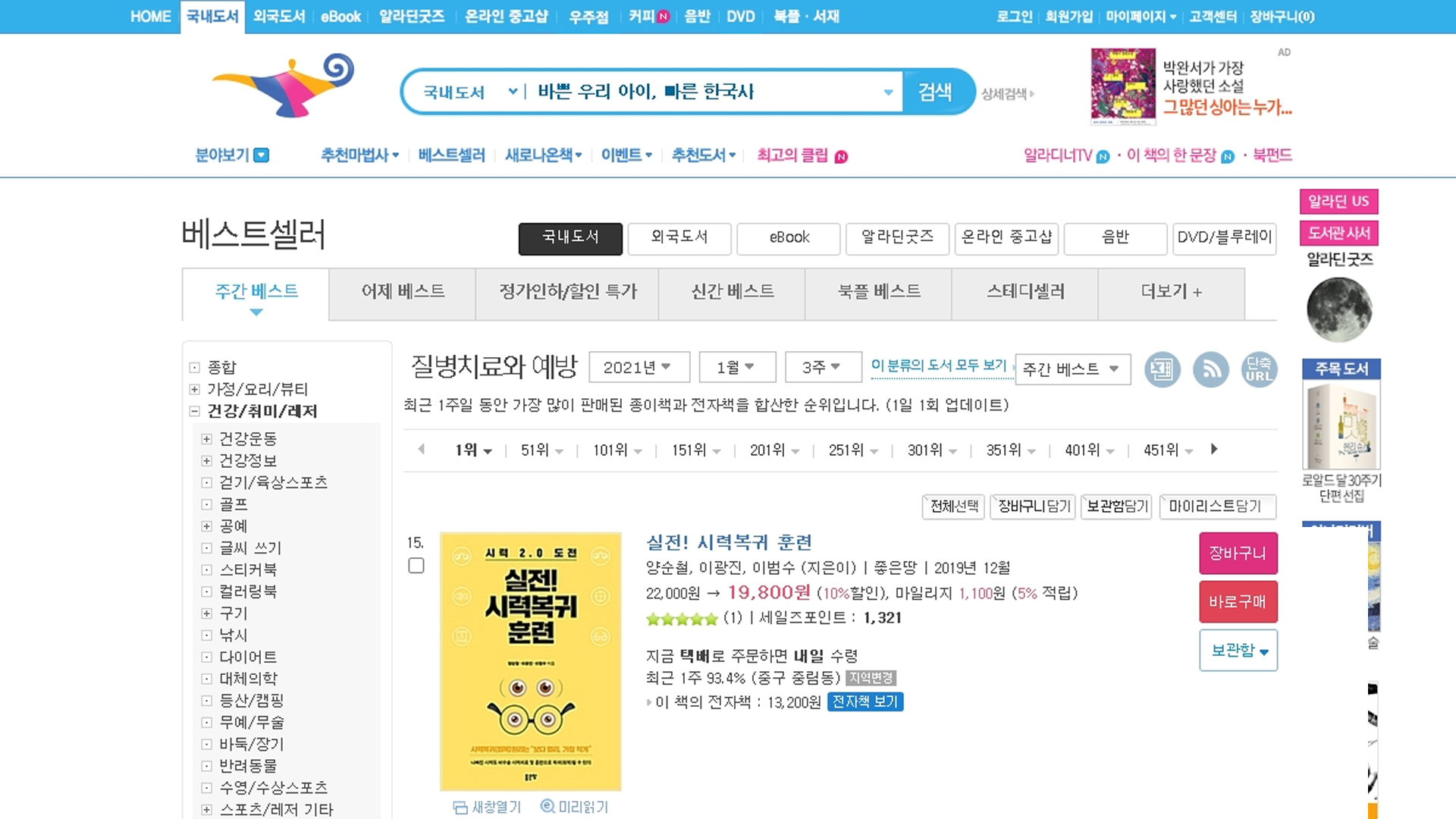 [베스트셀러]실전시력복귀훈련 알라딘 2021년 1월 3주 22일 베스트셀러 질병치료와예방 15위, 눈/코/입/귀 3위-눈 시력좋아지는법/눈운동/눈좋아지는법/온가족이 함께 하는 시력복귀(회복)훈련