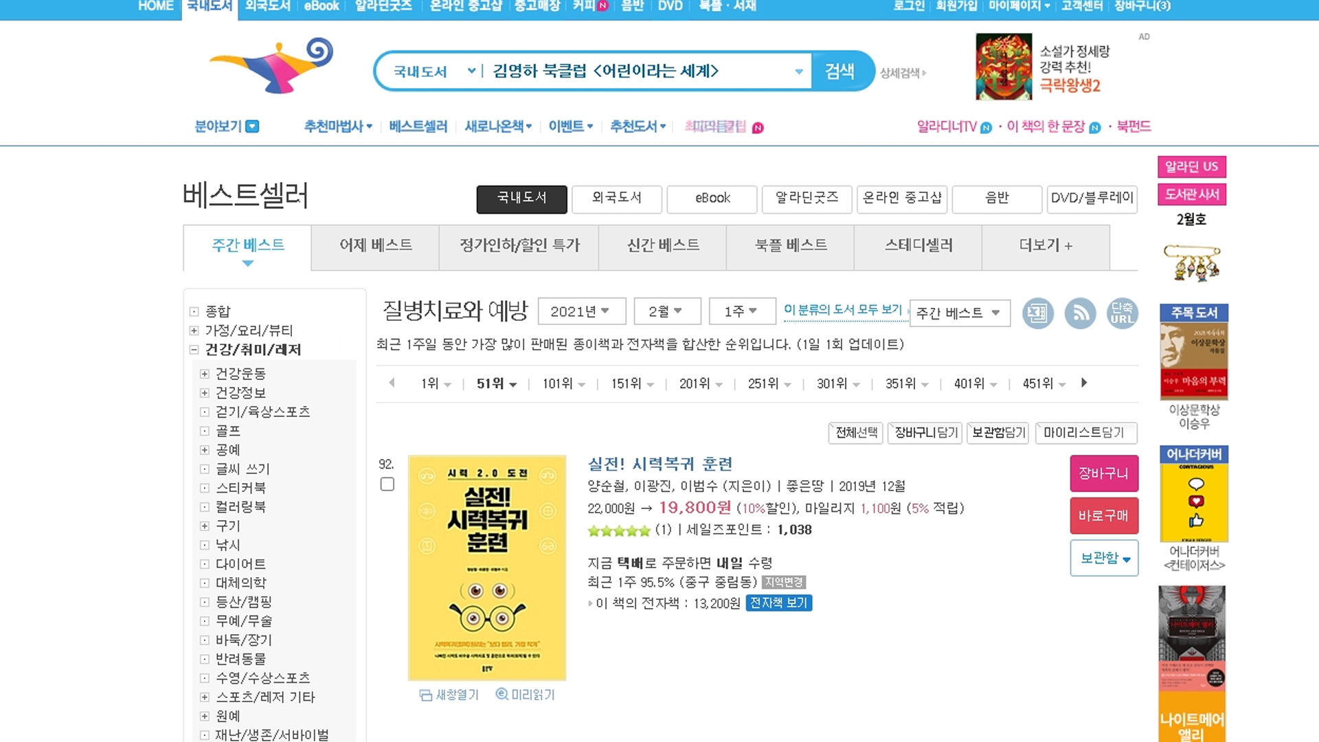 책 실전시력복귀훈련이 2월 1주 알라딘 질병치료와예방 주간 베스트셀러 92위입니다.