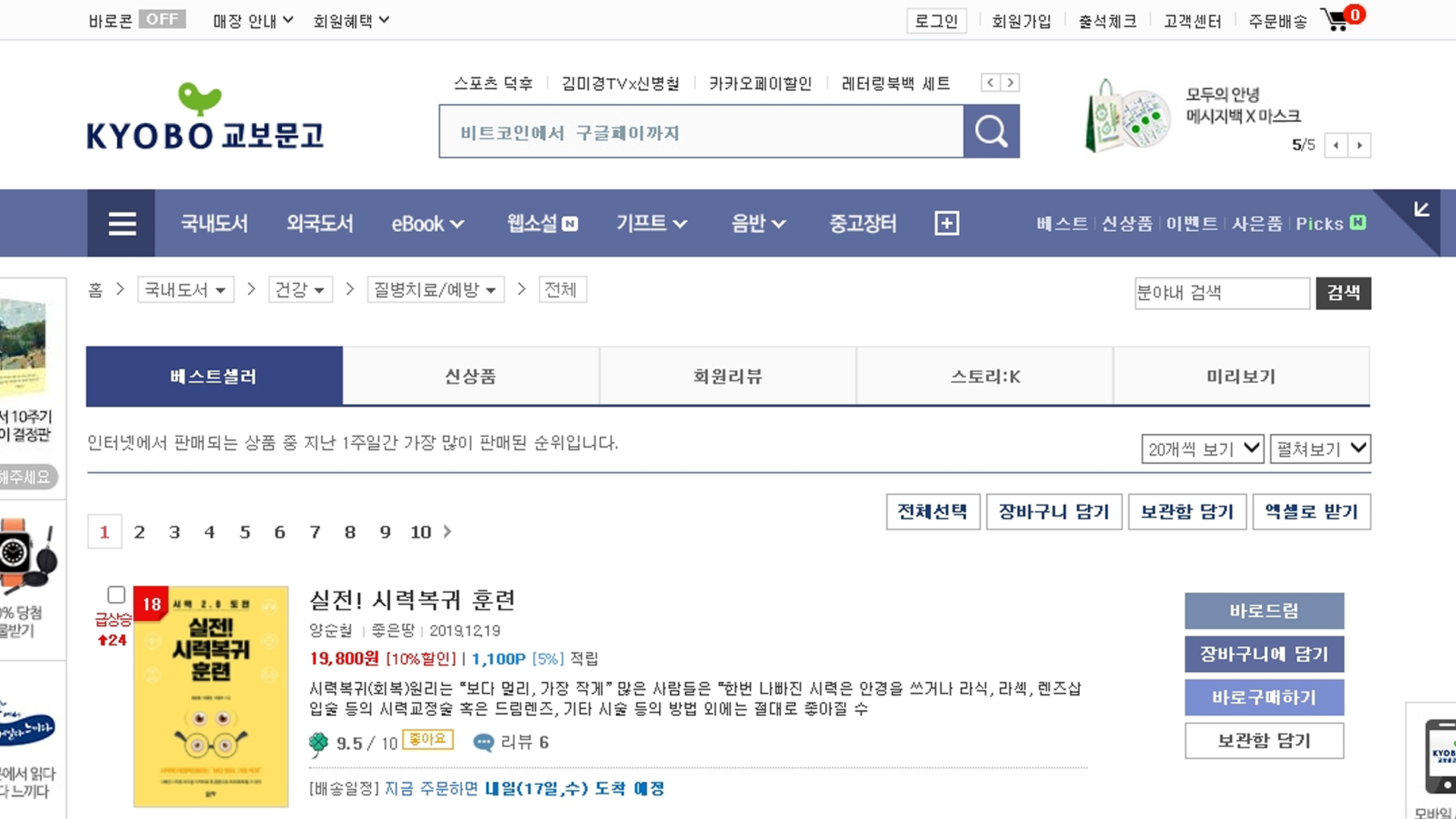 교보문고에서 점점 더 많은 분들이 책 실전시력복귀훈련에 관심을 가져주시네요 감사드립니다. 질병 치료예방 카테고리 주간 베스트 셀러 20위권 안으로 진입했네요. 교보문고 및 책 실전시력복귀 훈련에 더 많은 관심 부탁드립니다.