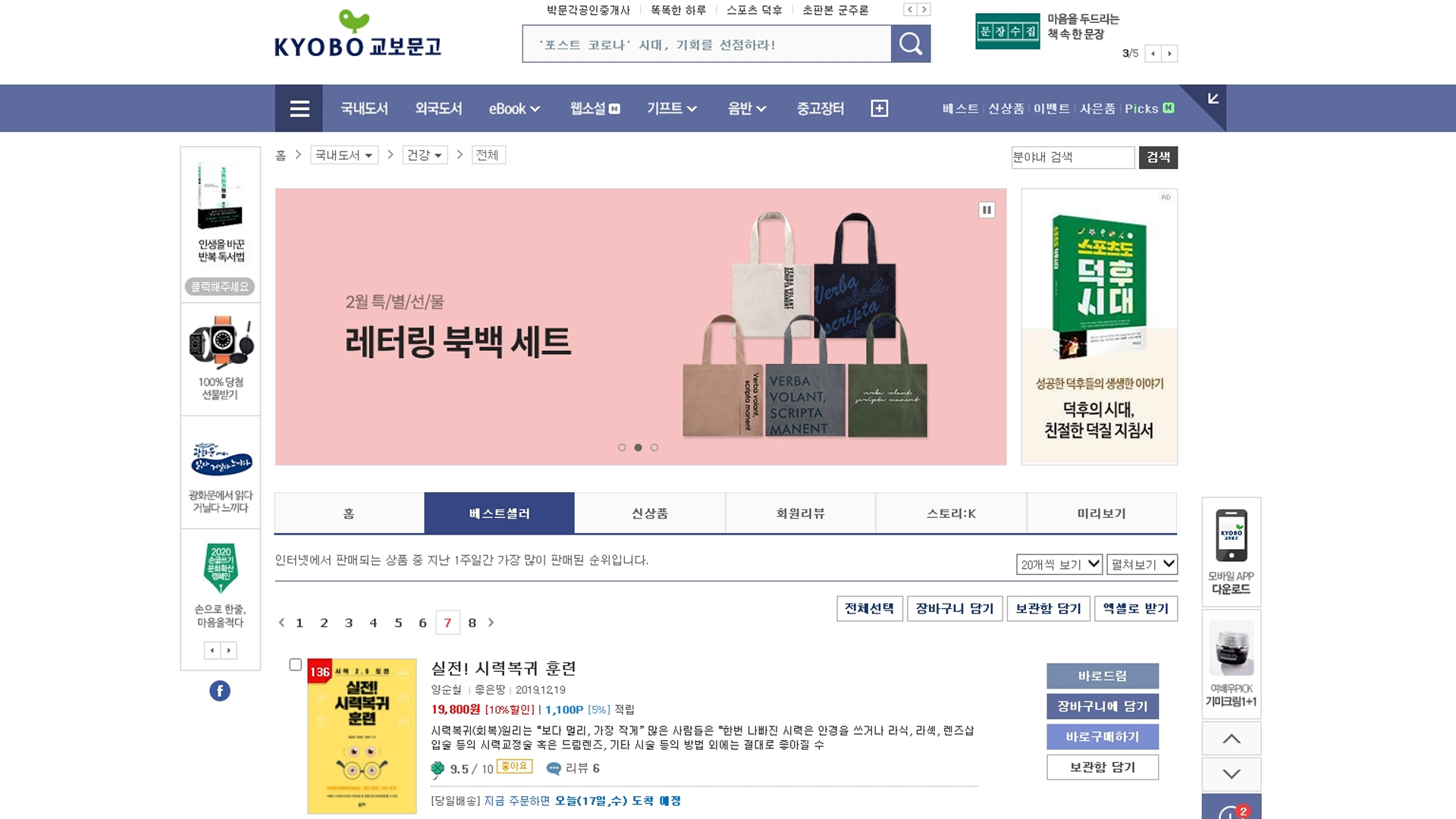 오랜만에 교보문고에서 건강 카테고리 주간 베스트 셀러 150위권 안으로 들어왔네요. 교보문고 및 책 실전시력복귀 훈련에 더 많은 관심 부탁드립니다.