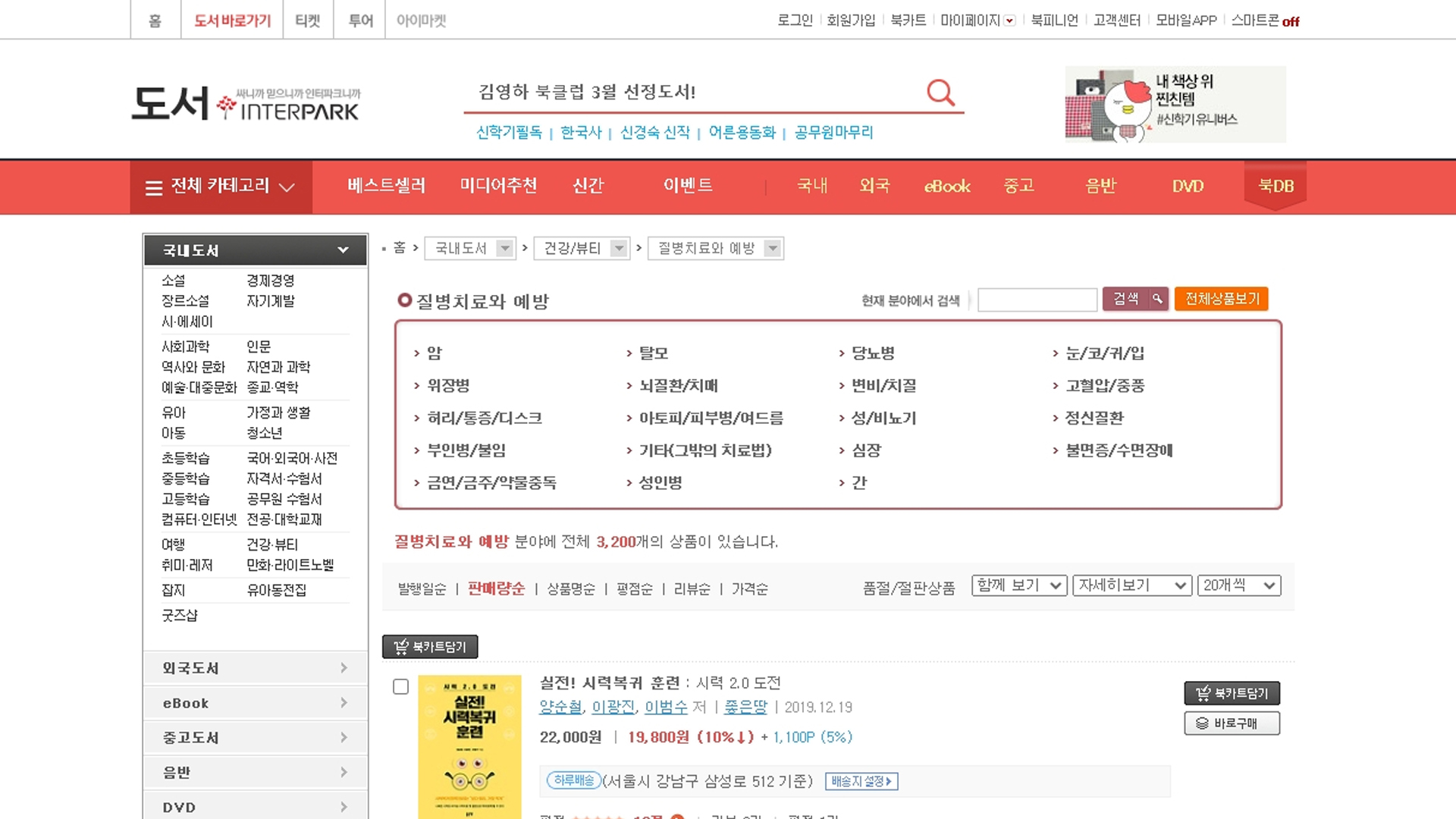 인터파크 베스트셀러 질병치료와예방 주간베스트 200위입니다.