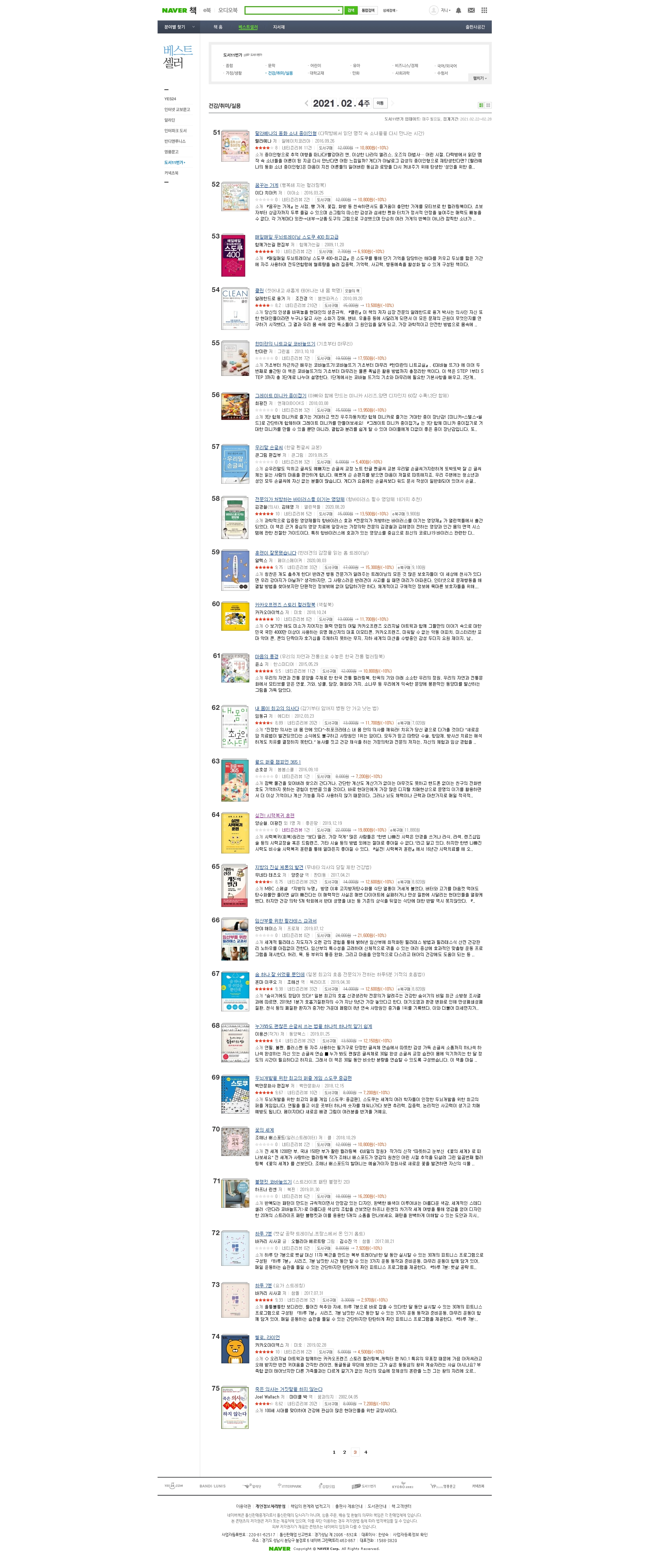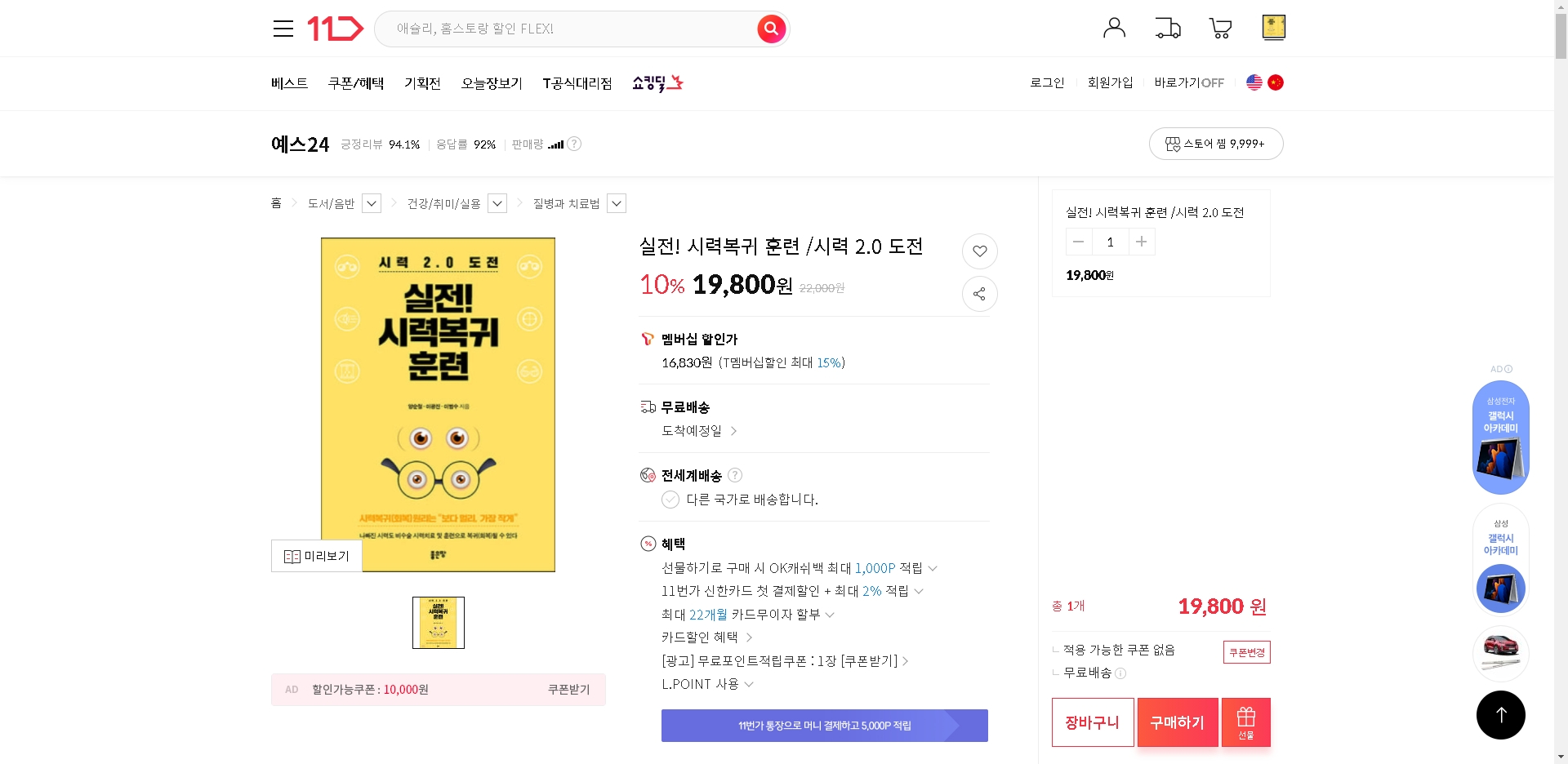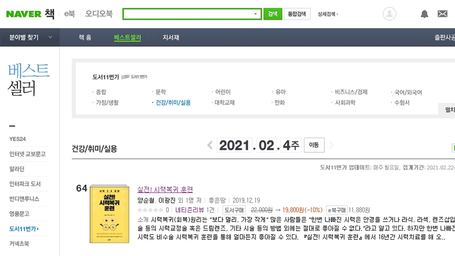 실전!시력복귀훈련 네이버 베스트셀러 도서11번가 2021년 2월 4주 주간 베스트 건강 취미 미용 64위