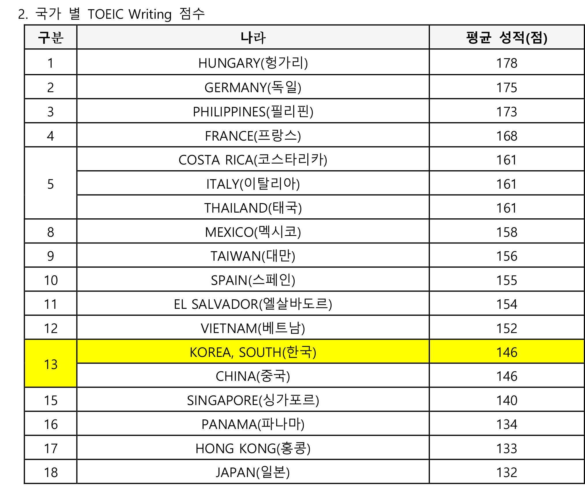 한편, 우리나라의 2019년 토익라이팅 평균 성적은 146점(200점 만점)으로, 성적 분석 대상 18개국 중 13위를 기록했다. 헝가리가 178점으로 가장 높았으며, 이어 독일(175점), 필리핀(173점), 프랑스(168점) 순이었다.
