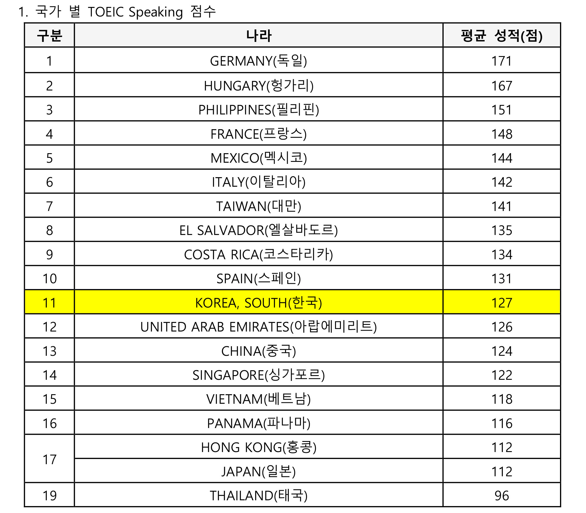 - 한국(127점)이 중국(124점), 일본(112점)보다 토익스피킹 평균 성적 높아